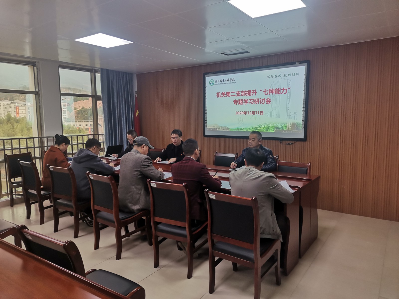 2020年12月11日下午,机关第二支部在学院行政楼610会议室,召开围绕提升“七种能力”专题学习研讨交流会,机关第二支部全体党员参加了会议,会议由支部书记吴兴旺同志主持。