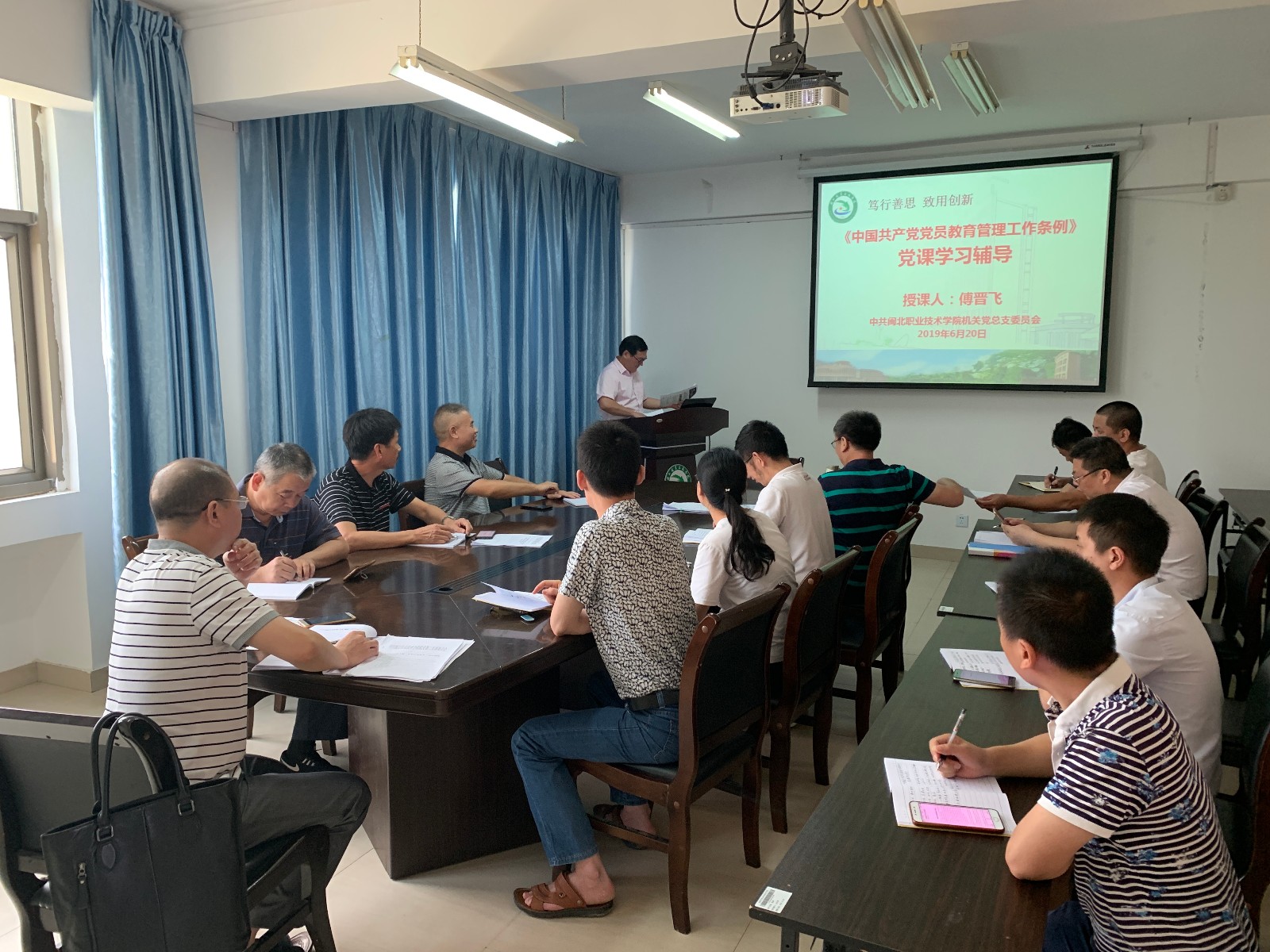2019年6月20日上午,学院机关党总支在行政楼五楼会议室,召开《中国共产党党员教育管理工作条例》(以下简称条例)学习会议,机关党总支全体党员参加了学习会议。会议由机关党总支叶常明书记主持。机关党总支常务副书记傅晋飞同志作《条例》专题党课学习辅导。通过学习,机关党员了解了《条例》出台的背景和意义、制定遵循的原则,熟悉了党员教育的基本任务、党员教育管理的主要方式、党籍和党员组织关系管理、党员监督和组织处理及党员教育管理信息化等内容。