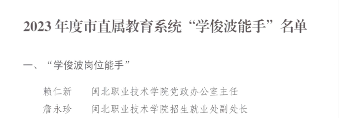 为深入学习贯彻习近平新时代中国特色社会主义思想和党的二十大精神,落实习近平总书记关于教育工作的重要论述精神,按照市委“深学争优、敢为争先✊🏻、实干争效”行动部署,在学院涌现一批政治坚定、敢于担当 、敢拼敢闯、成绩突出、群众认可的先进典型,近日,市委教育工委表彰了一批“学俊波能力”,我院赖仁新、詹永珍等二位同志被授予“学俊波岗位能手”荣誉称号;白雁飞、魏常锦🚣🏼、张海丽、张梦君等四位教师被授予“学俊波教学能手”荣誉称号。