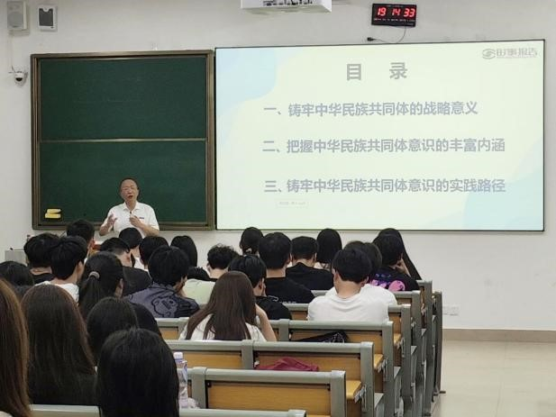 张雄聚焦“中华民族共同体”这一概念,以《我们是一家人》的视频镜头为引,围绕“铸牢中华民族共同体的战略意义”、“把握中华民族共同体意识的丰富内涵”👩🏼🔬、“铸牢中华民族共同体意识的实践路径”三个方面,带领同学们共同感受民族团结、祖国强大的磅礴伟力。