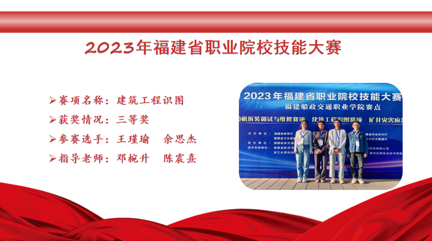 本次大赛得到了学校领导高度重视和大力支持,各部门积极筹备组织。在备赛过程中,校院领导多次慰问参赛师生👱🏼♂️,给予鼓励与支持。教务处认真准备,为省赛做好动员组织工作,各个参赛系从选手选拔到备赛各环节细致组织安排,参赛师生加班加点,进行高强度训练,参赛选手在比赛中沉着应战🤘🏿。近日,福建省职业院校技能大赛获奖选手名单公布,我校师生获得一等奖1项、二等奖8项,三等奖14项。