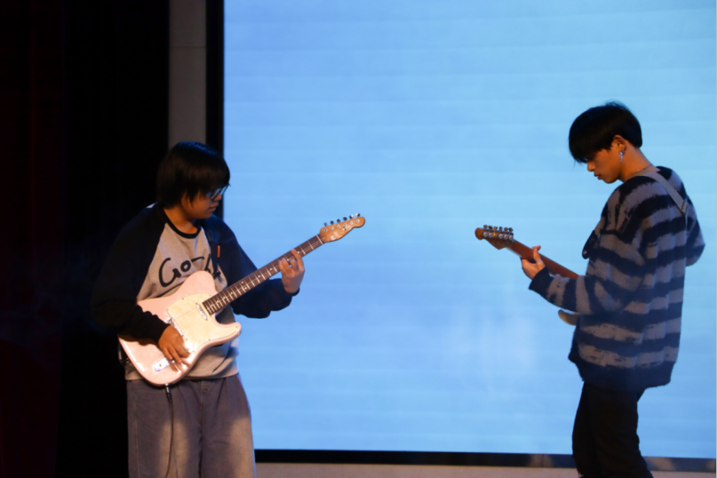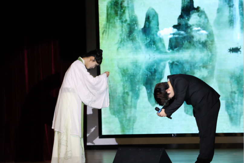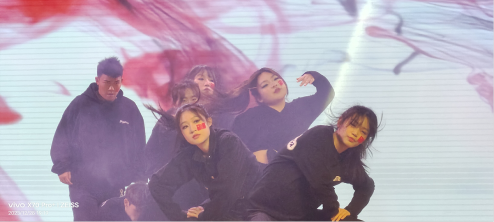 晚会在热情洋溢的啦啦操和战胜鼓表演《红韵》中拉开帷幕。