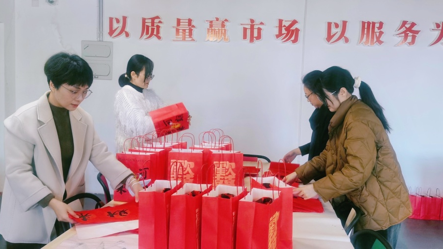 各工会小组还发挥专业特长,为全体教职工准备了别出心裁的新春祝福,食品系制作了甜美的糕点;设计系和管理系的“福袋”中包含由学院“胡紫薇茶洋窑制作技艺传承人工作室”制作的精美的茶洋窑及教职工亲手书写的春联。