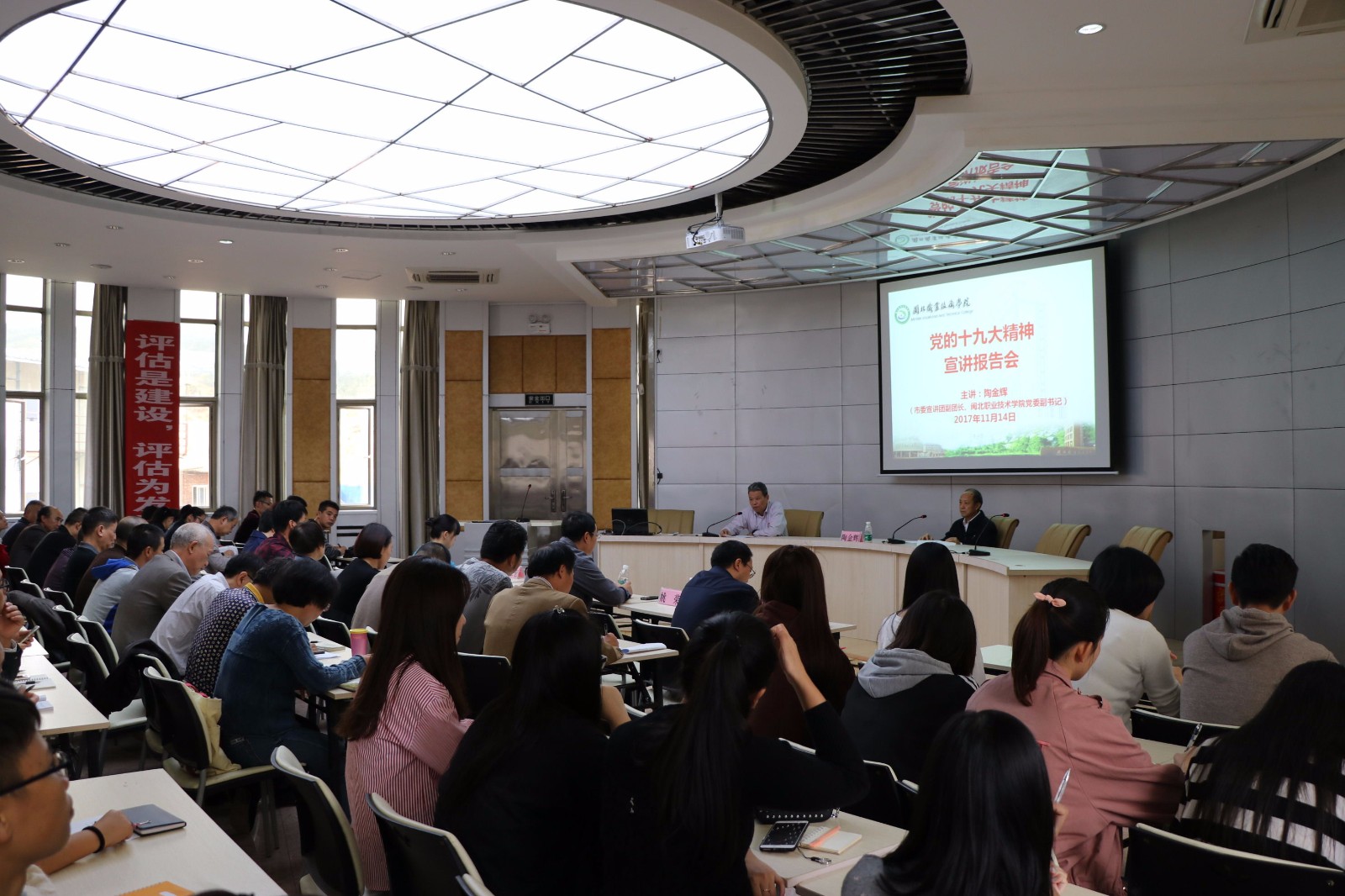 11月14日下午,市委宣讲团到我院宣讲党的十九大精神,市委宣讲团副团长、学院党委副书记陶金辉同志为学院党政班子成员、中层以上干部、师生代表70余人作了宣讲报告。学院党委书记高建富同志主持报告会。