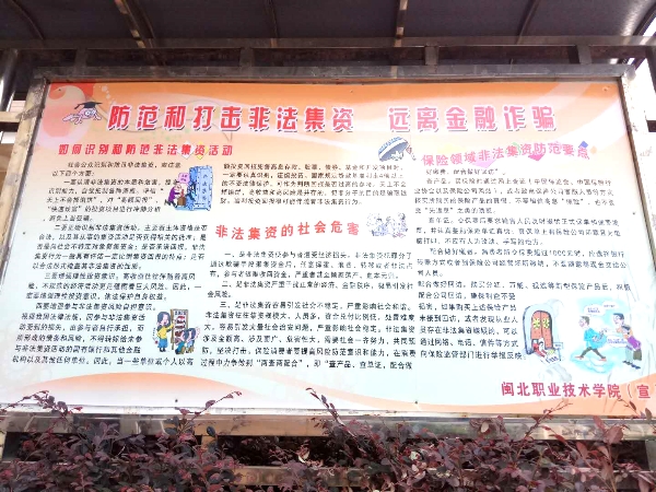 为了深入贯彻学习《南平市打击和处置非法集资工作领导小组办公室关于印发2018年南平市防范非法集资宣传月工作方案的通知》和南平市教育局的相关文件精神,通过在全院范围内集中开展防范非法集资宣传月活动,有效提高大学师生的金融知识水平、风险防范意识,增强对非法集资等非法金融活动的识别能力,自觉远离和抵制非法集资,从源头上遏制非法集资风险,在全院形成防范和抵制非法集资的浓厚氛围。
