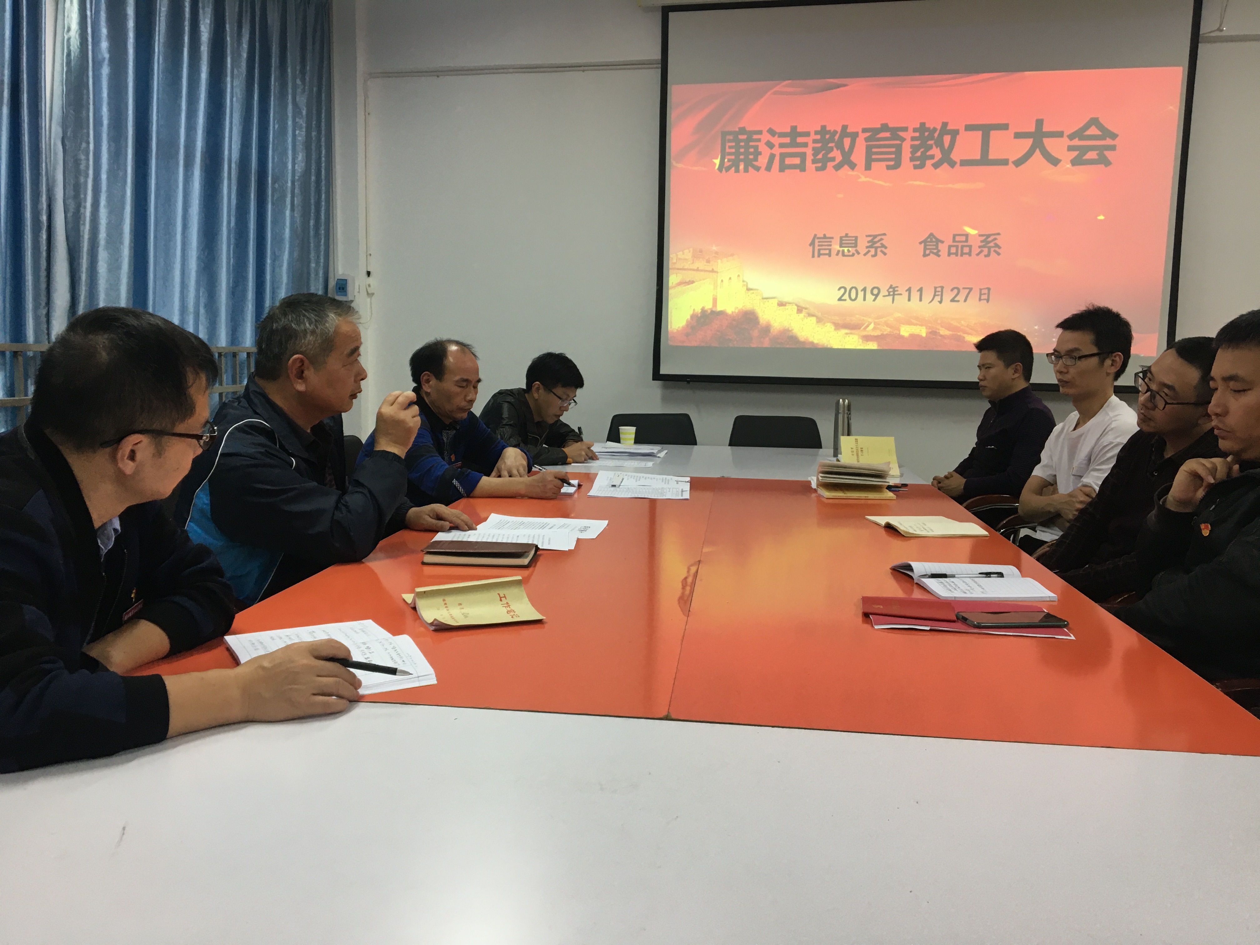 11月27日下午,信息系和食品系召开了廉洁从教专题会议,两系教职工参加了会议,院纪检监察审计处处长郑定华同志前往指导工作。