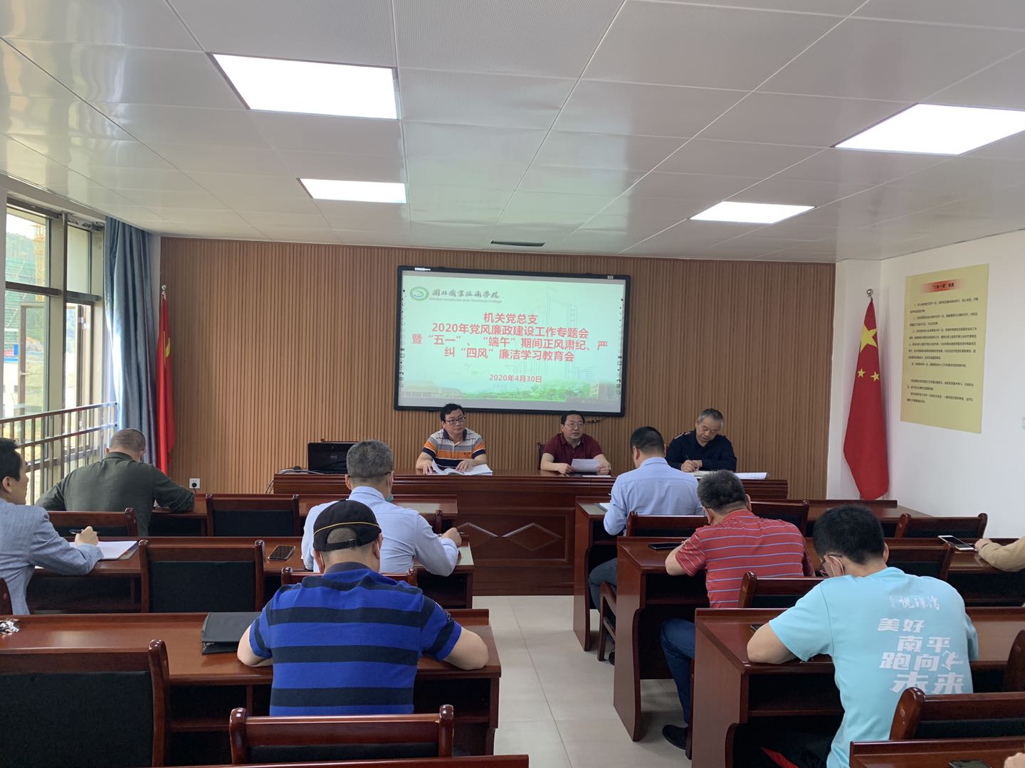 2020年4月30日上午,在行政楼610党员活动室召开机关党总支2020年党风廉政建设工作专题研究会暨“五一、端午”期间正风肃纪、严纠“四风”廉洁学习教育会。机关党总支班子成员,各支部书记、支部委员及党委工作部、学院办公室全体工作人员参加了会议。机关党总支挂点领导院党委委员、党委工作部部长蔡军同志到会并讲话。会议由机关党总支常务副书记傅晋飞主持。