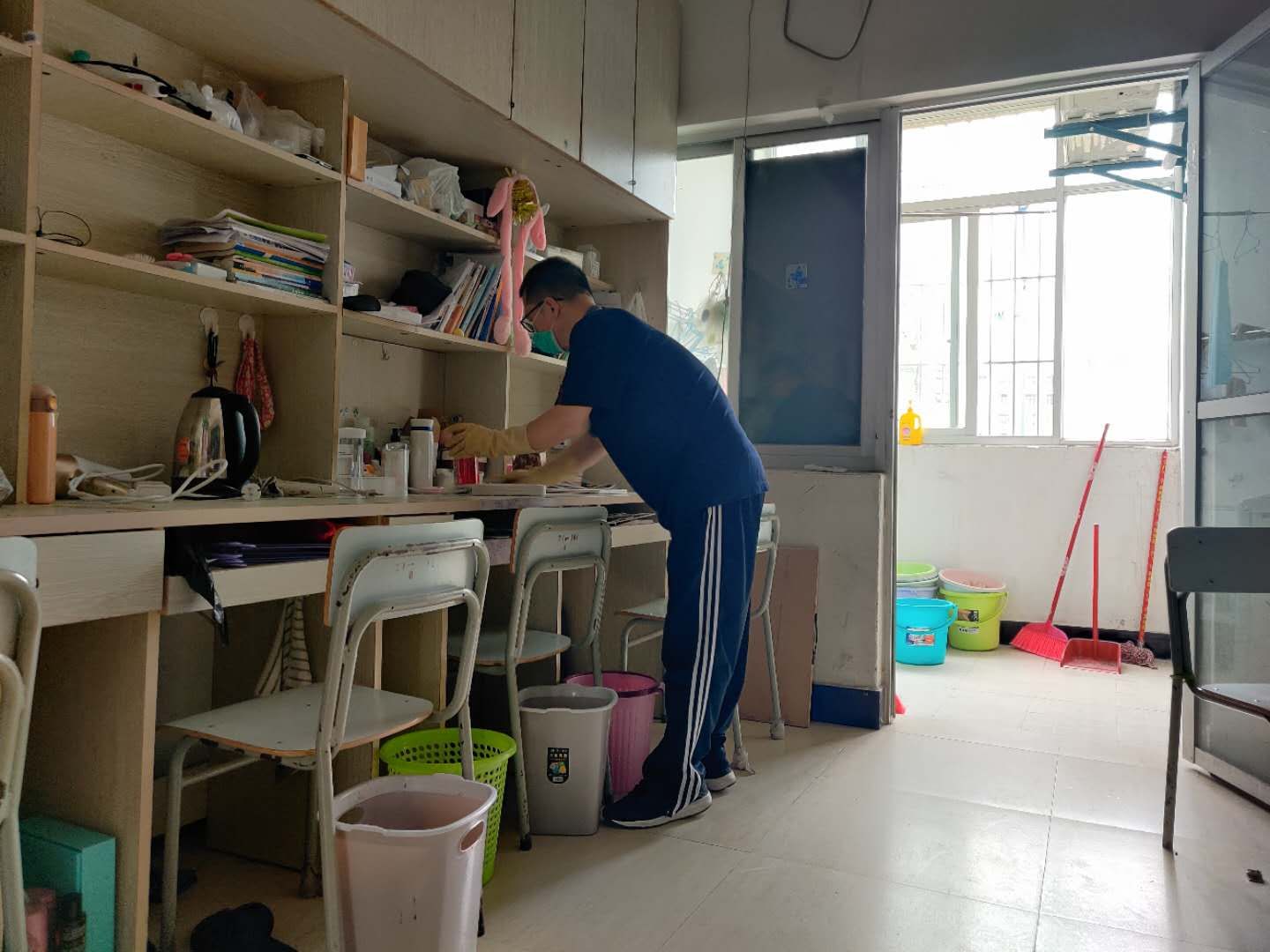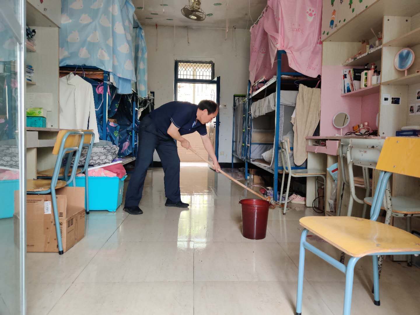 有的老师为了不影响白天的工作,天刚刚亮就起床为同学们清扫擦洗宿舍;有的老师忙到中午忘记了吃饭依然开心地拖着地板,就像为他乡求学的自家孩子整理行囊;有的抱着即将霉变的被子、草席疾步冲到天台,就怕太阳被云遮盖。老师们辛勤地耕耘者、爱护着,始终把同学们的健康摆在首位。