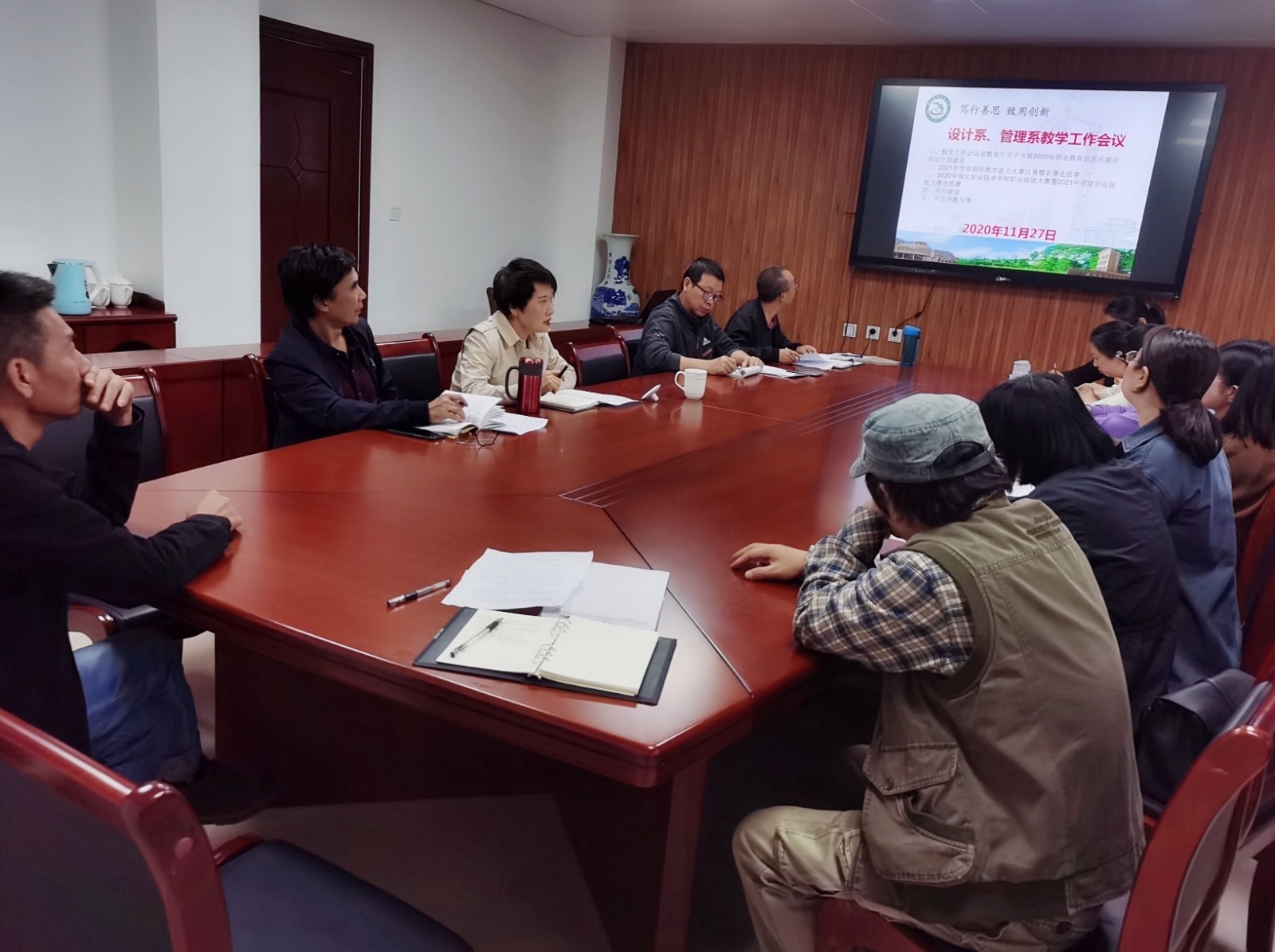 2020年11月27日下午在行政楼501会议室,设计系兼管理系主任陈婷组织召开教学工作专题会议。两系全体教职工参加。