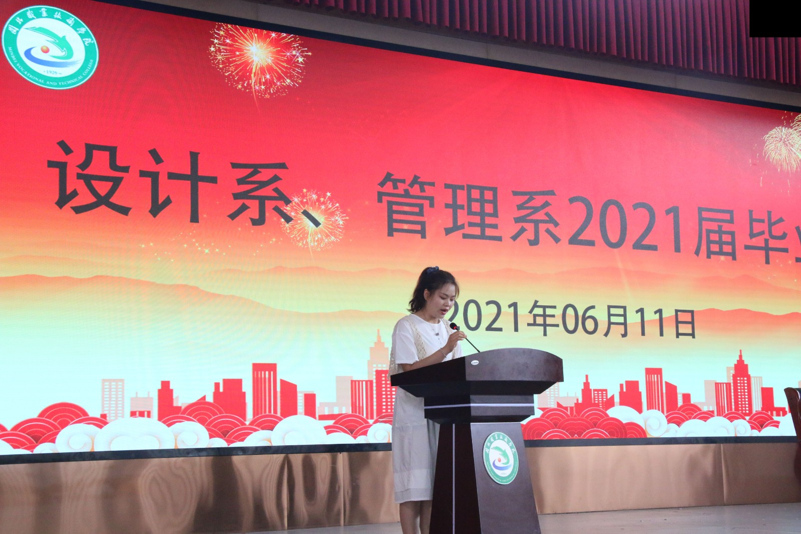 陈婷主任代表全系教师,对毕业生们圆满完成学业,顺利毕业表示祝贺,并代表设计系、管理系及全系老师对毕业生提出五点希望:一是希望大家尽快认清“新起点”,适应“新身份”,承担“新责任”;二是希望大家始终保持对知识的渴求,做好终身学习的准备;只有坚持学习,主动接受和吸纳新知识、新观念才能跟上时代的发展步伐;三是希望大家永葆初心,不断进取,立志成才;四是学会合作、学会理解、包容他人,唯此才能“飞”的更高、更快、更远。五是坚持传承与创新。面对未来要充满信心,敢于担当、勇于创新,为创造未来的幸福生活而不懈努力。希望2021届毕业生牢记“笃行善思、致用创新”的校训,以高度的社会责任感成就自我,服务社会,奉献国家。