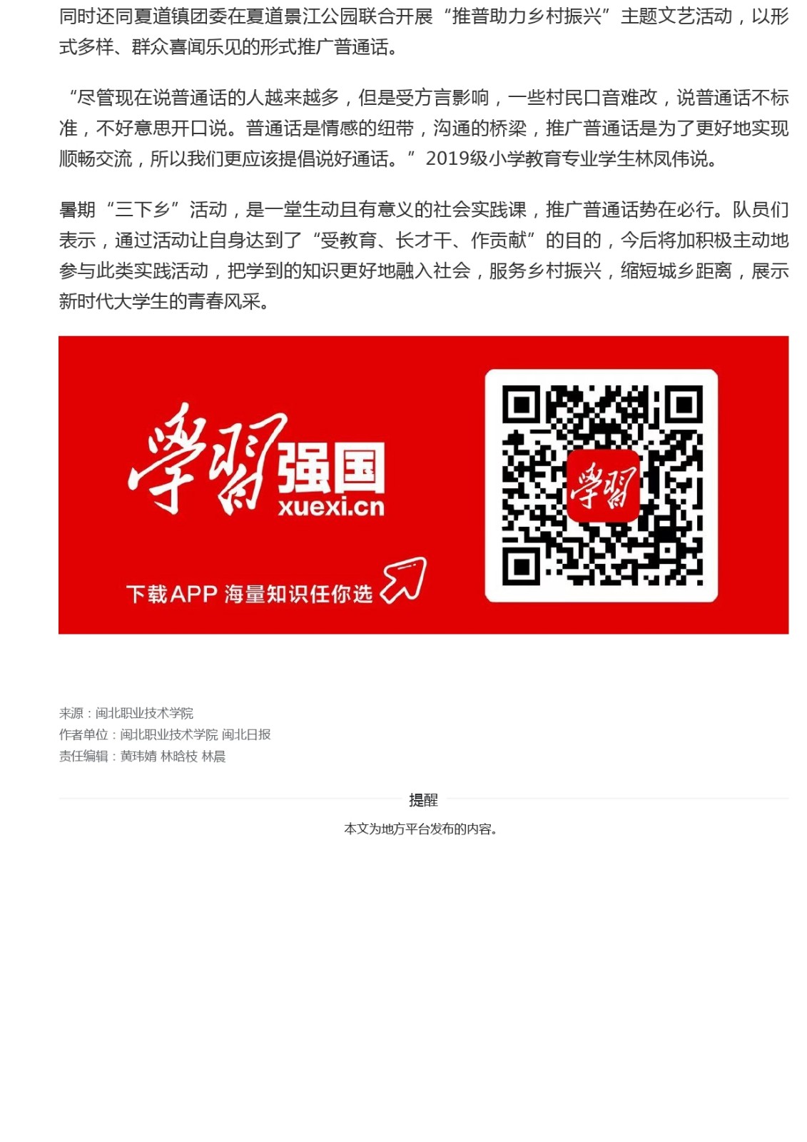 “阿姨,您和亲朋好友聊天是说方言还是普通话呢?”“和孩子们交流还是尽量使用普通话比较好。”近日,南平市延平区夏道镇的村头巷尾忽然热闹起来,彩神教育系团总支联合夏道镇团委在这里开展了推广普通话、助力乡村振兴的暑期“三下乡”社会实践活动。