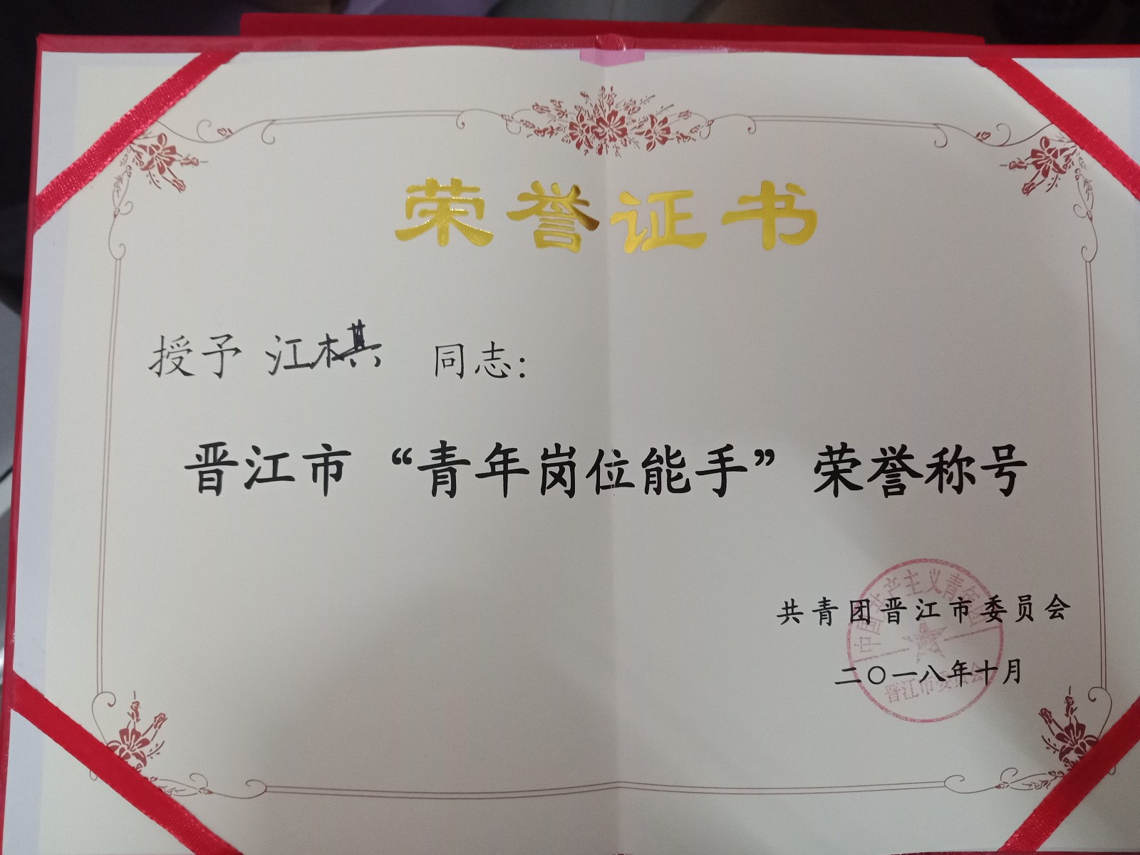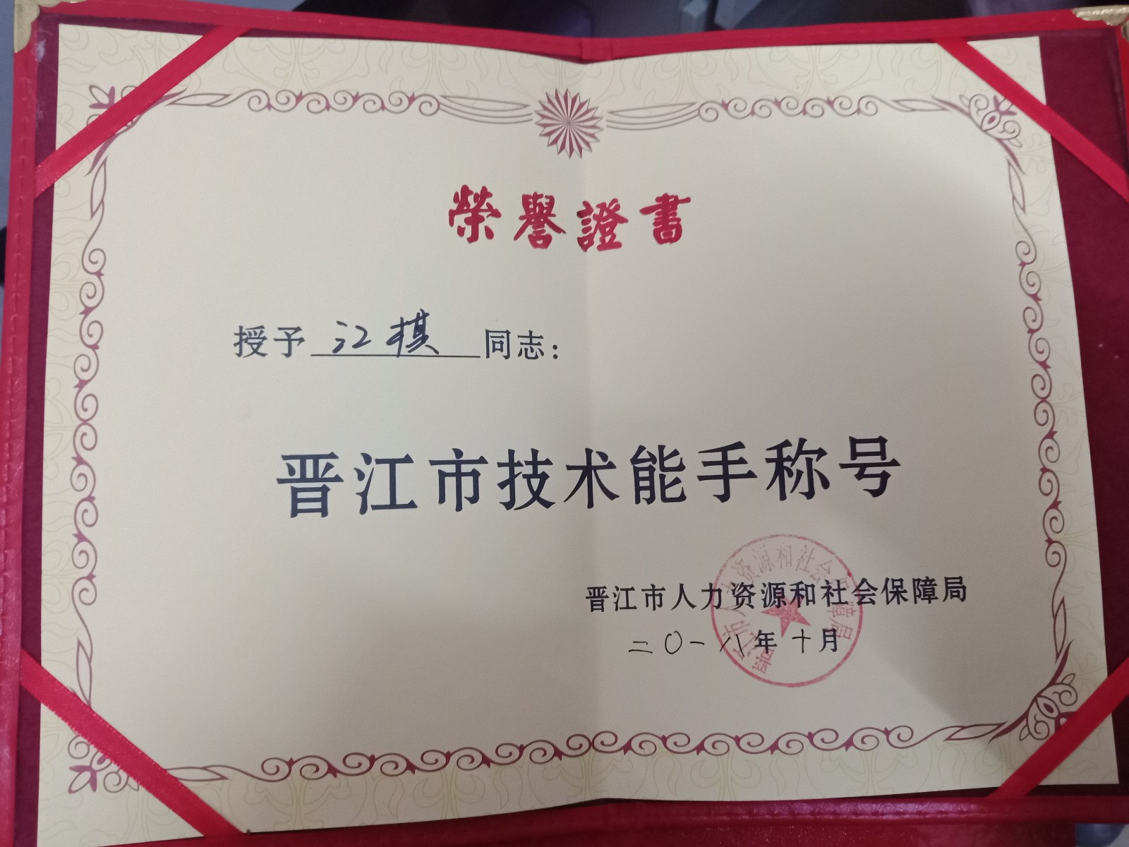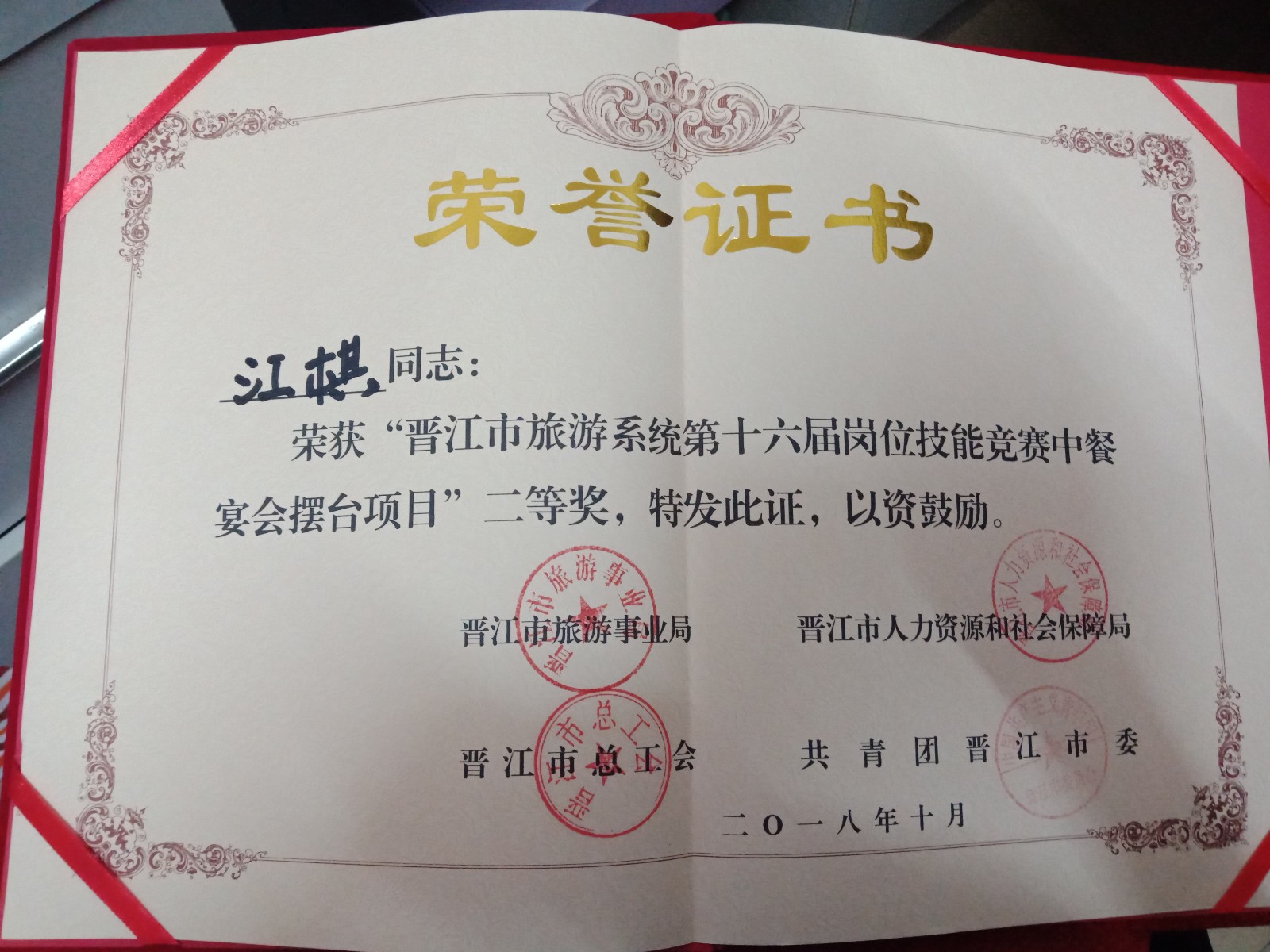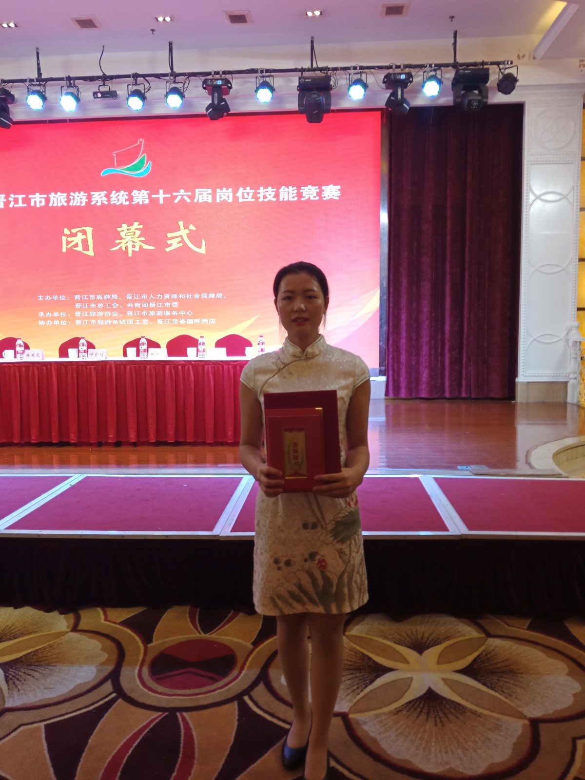 近日,管理系旅游管理专业在晋江宝龙大酒店顶岗实习的江棋同学代表酒店参加晋江市旅游系统第十六届岗位技能竞赛,荣获中餐摆台宴会项目二等奖,并荣获“晋江市技术能手称号”和晋江市“青年岗位能手”荣誉称号。