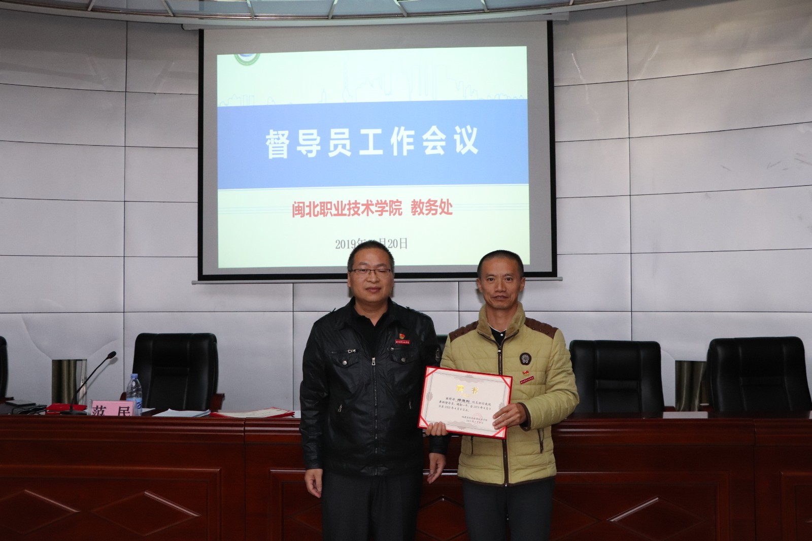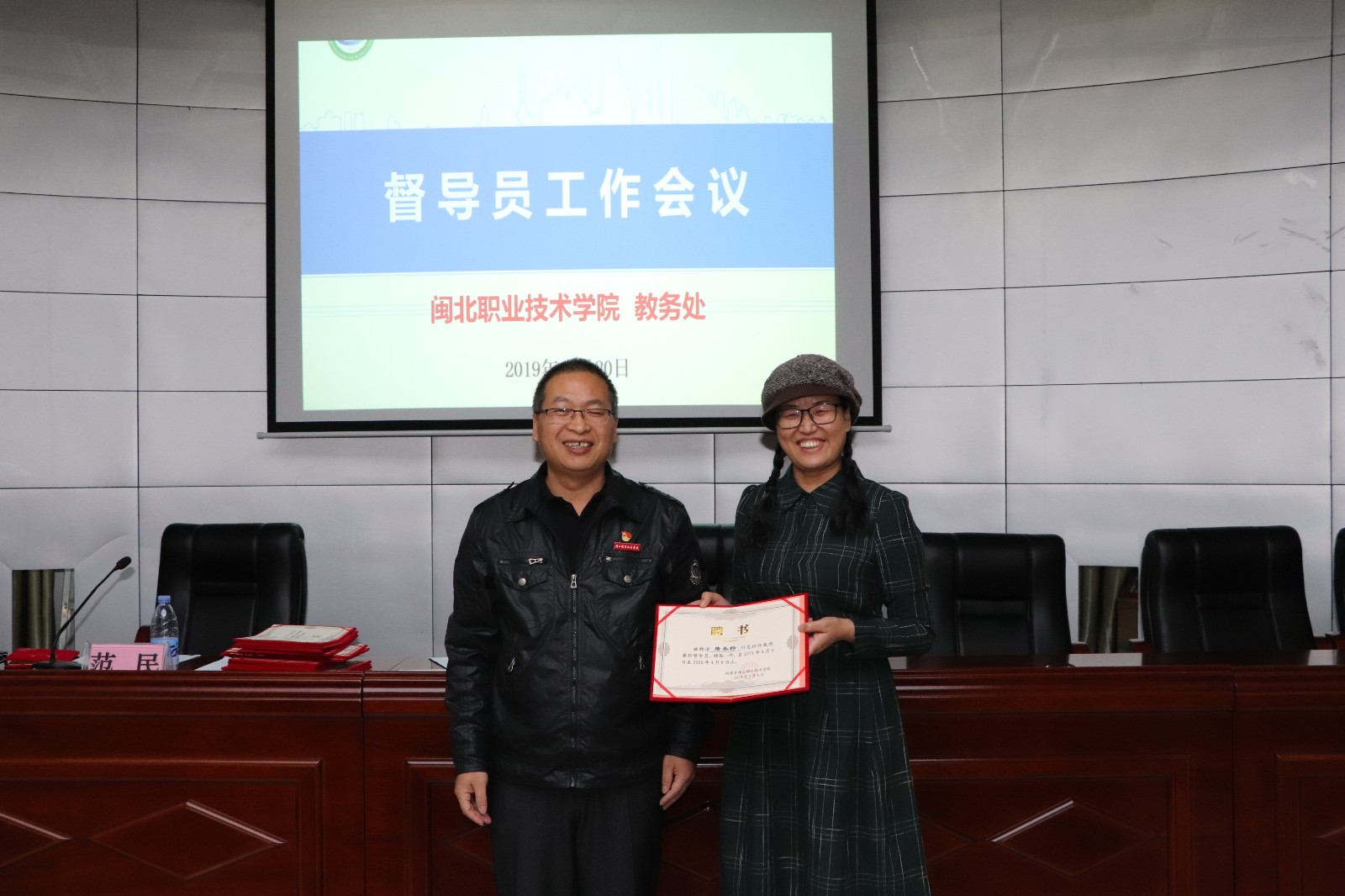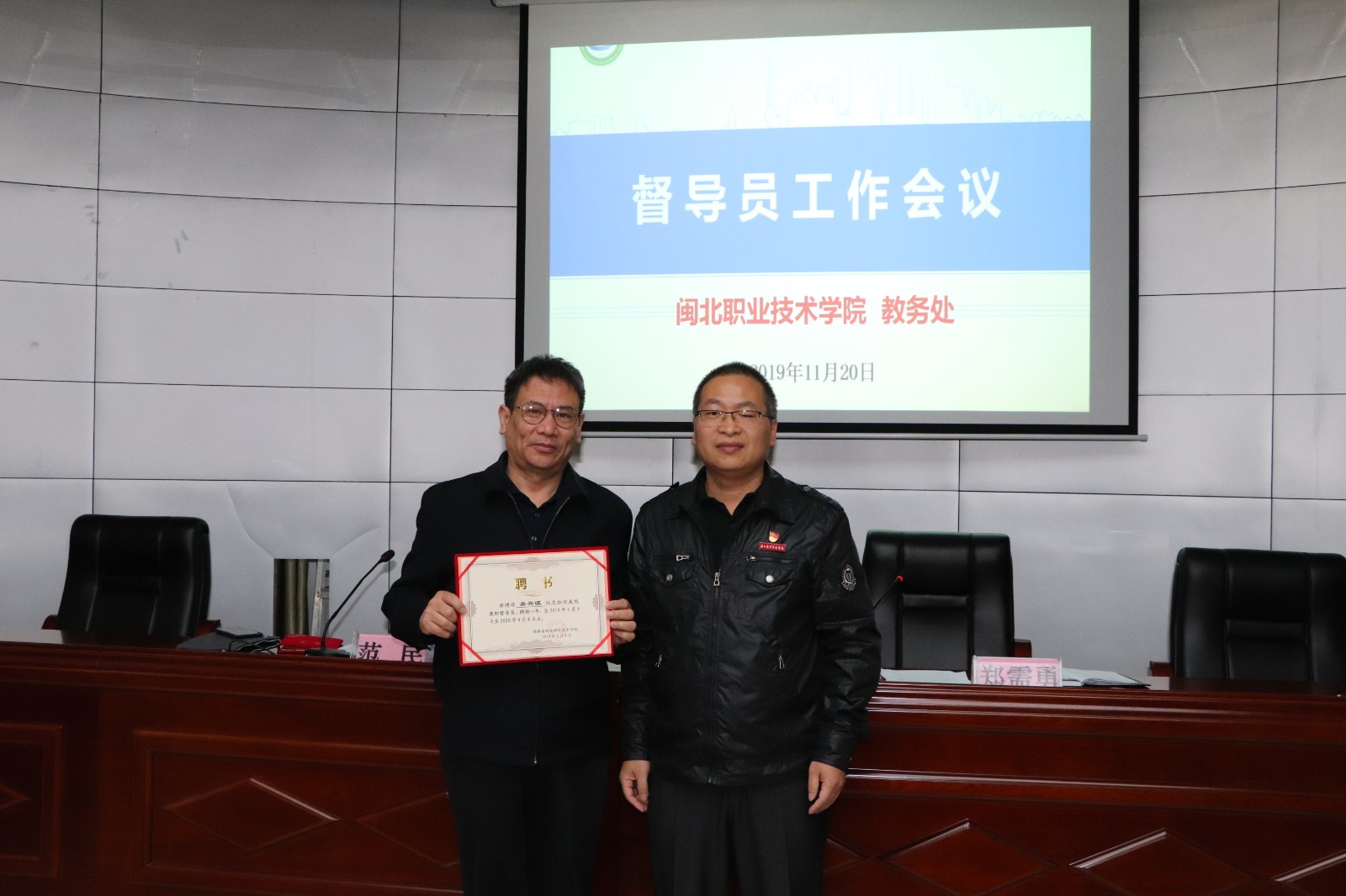 会后举行学院督导员聘任仪式,人事处副处长傅晋飞同志宣读聘任通知,郑副院长为新聘任的督导员颁发聘书。