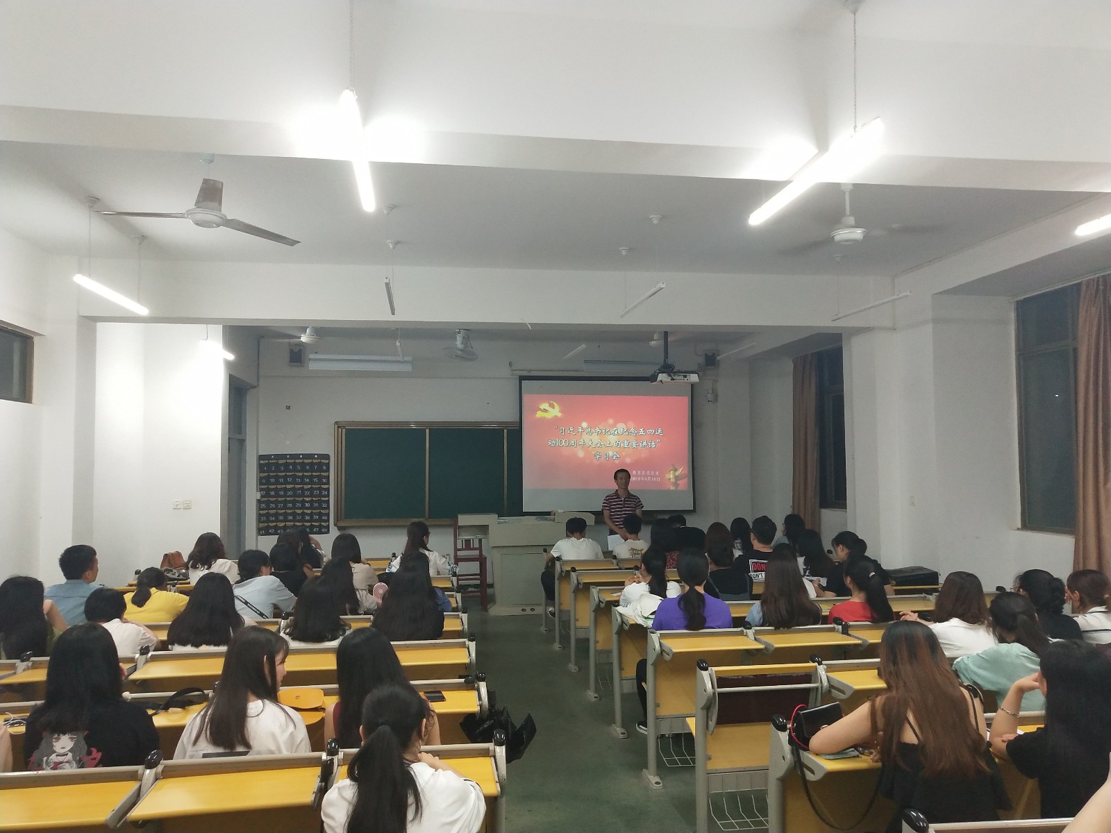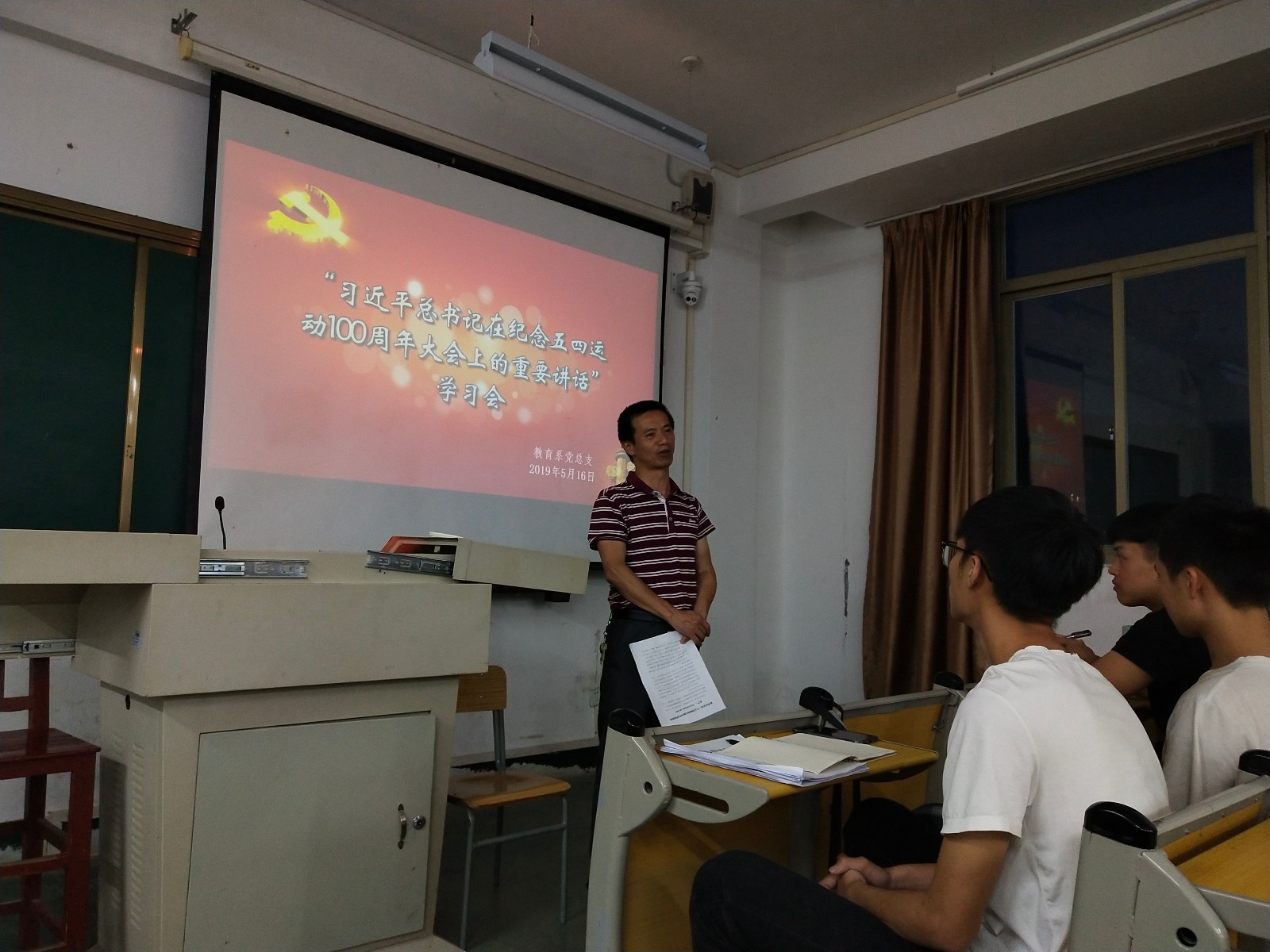 2019年5月16日,教育系党总支在博学楼301开展习近平总书记在纪念五四运动100周年大会上重要讲话学习会。本次学习会由教育系党总支副书记邱海松主持,预备党员、入党积极分子、主要学生干部代表80余人参会。