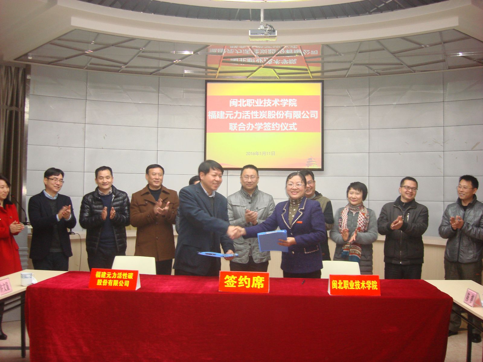 2016年1月11日下午🧑🏽🍳,学院与福建元力活性炭股份有限公司“元力订单班”签约仪式在学院一楼报告厅隆重举行。南平市延平区委常委张嘉明🦄,延平区教育局局长黄敏👩🏻🦼、区政府教育督导室主任🦹🏻♂️、区教育局副局长林进👩🦰、我院院长黄亚惠、福建元力股份公司总裁官伟源,元力公司副总裁许文显🙎🏿♀️、行政总监郑超凡级我院教务处、实训与就业处、食品与生物工程系等相关部门负责人参加了签约仪式。