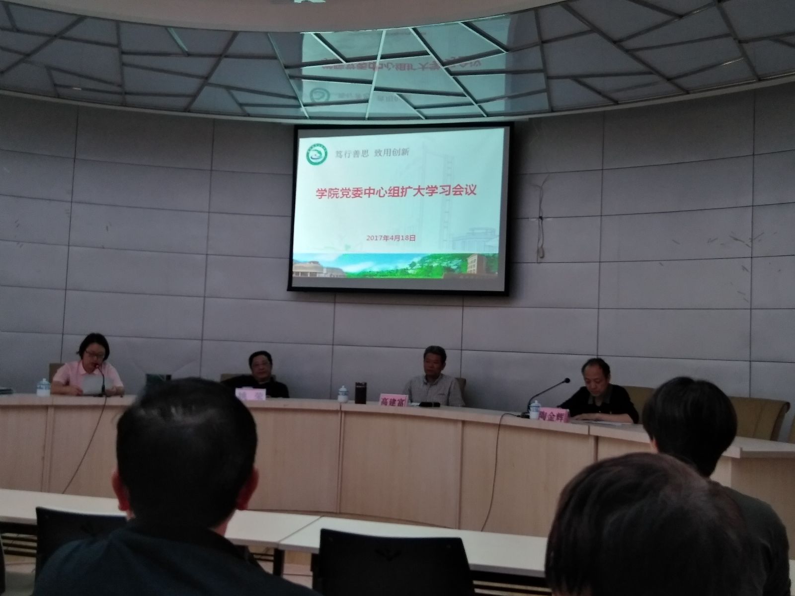 4月18日下午🌞,我院在办公楼一楼报告厅召开了“学院党委中心组扩大学习会议”🏃🆔,会议内容为学习廖俊波同志先进事迹⛄️,会议由党委副书记陶金辉主持🖍,学院各处室及各系部负责人、党总支负责人参加了会议,我系张金良主任、郑启阶副书记参加了会议。
