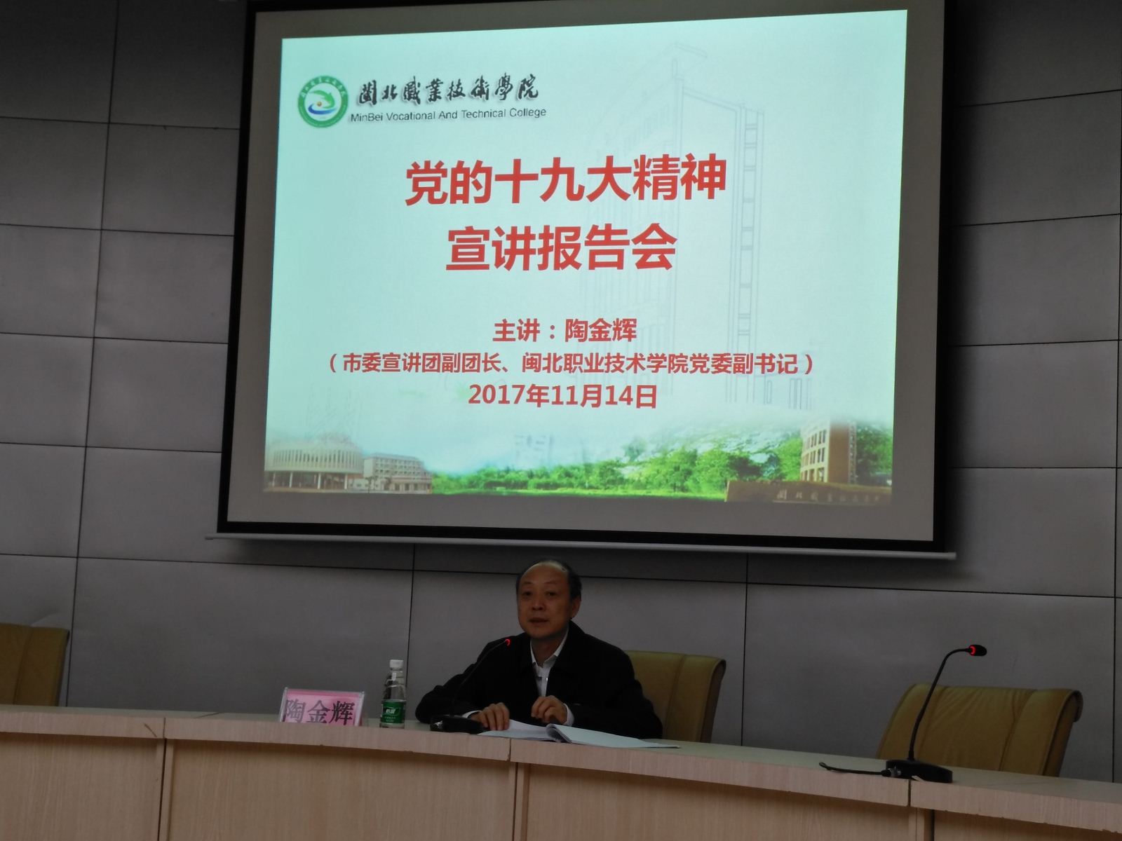 2017年11月14日下午,我院党的十九大精神宣讲报告会在行政办公楼一楼报告厅举行,南平市市委宣讲团副团长、院党委副书记陶金辉同志作了宣讲报告,院中层以上党员干部、各总支委员、支部委员、学生代表等70余人参加了报告会,我系领导主任🎐、总支副书记张金良🩰🙆🏿♀️,系常务副书记郑启阶等出席了会议。陶副书记从“关于十九大的主题、成果”、“关于习近平新时代中国特色社会主义思想”等八个方面进行了宣讲。宣讲全面🕵🏻♀️、到位,切合实际,全体与会人员对党的十九大精神有了更深入的认识。报告会结束后,陶副书记现场接受了学生的采访,对学生提出的问题进行了一一解答。