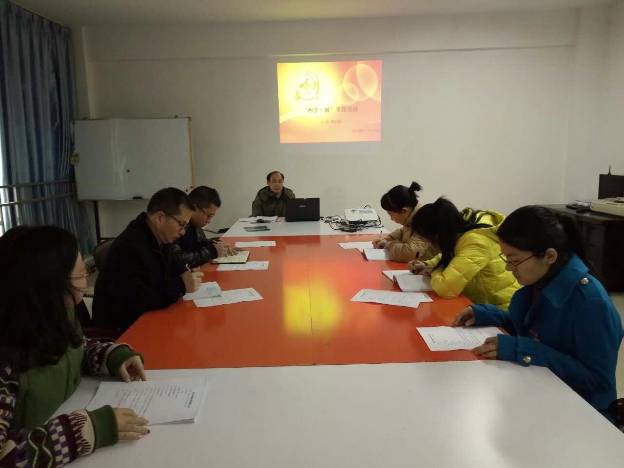 2016年12月29日上午🍹,食品与生物工程系党总支全体总支委员在办公楼407室集中上党课,党课主题为“两学一做专题党课”🤾🏼,主讲为系常务副书记郑启阶同志,参加本次党课学习的我系领导还有张金良主任等。
