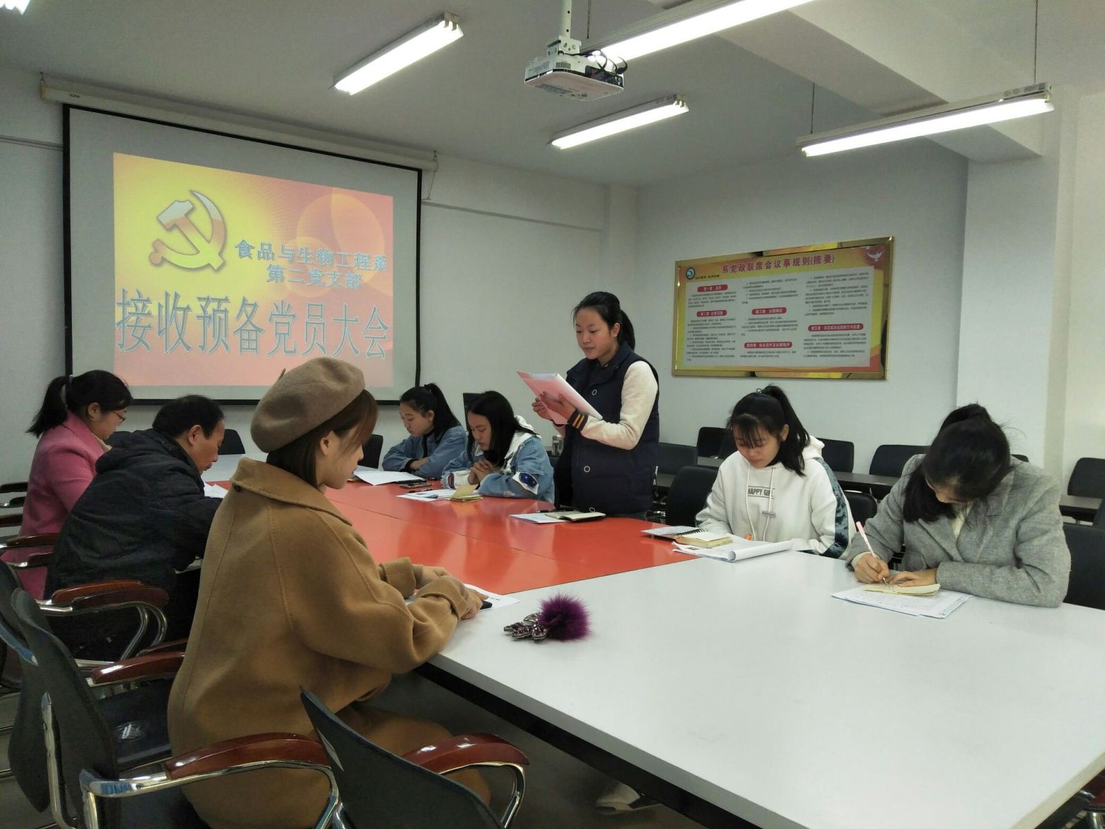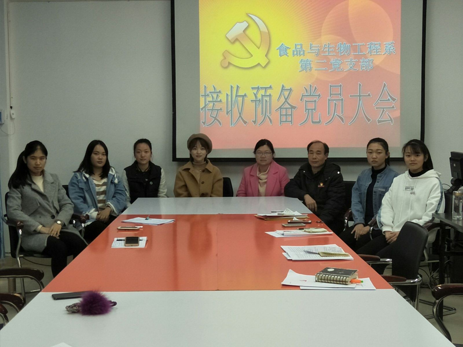 食品与生物工程系第二党支部于二0一八年一月二日下午两点三十分🙎🏼,在行政楼407会议室举行了接收预备党员支部大会。党总支部郑启阶书记以及食品与生物工程系第二党支部全体党员💂🏻♂️、发展对象参加了此次会议。会议主要讨论了是否接受廖红珍🦶🏻、李 虹、曾小芸😱、曾巧艺等4位同志为中共预备党员的问题📘,大会由食品与生物工程系第二党支部黄妍书记主持。