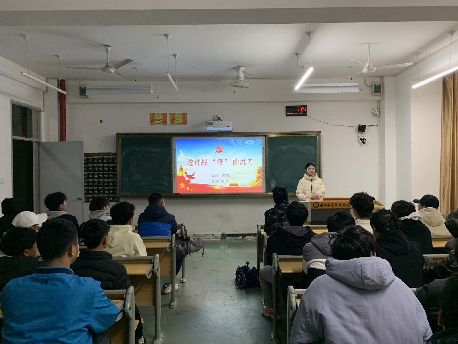 第二党支部书记胡建辉🧼、辅导员宋智伟✧、林锐敏、罗丽霞分别以《建党99周年》🤴🏻、《治国理政第三卷之推动全面深化改革实现新突破》、《“疫”后的青年担当》💫、《透过战‘疫’的思考》为题开展党团课培训👆🏼。