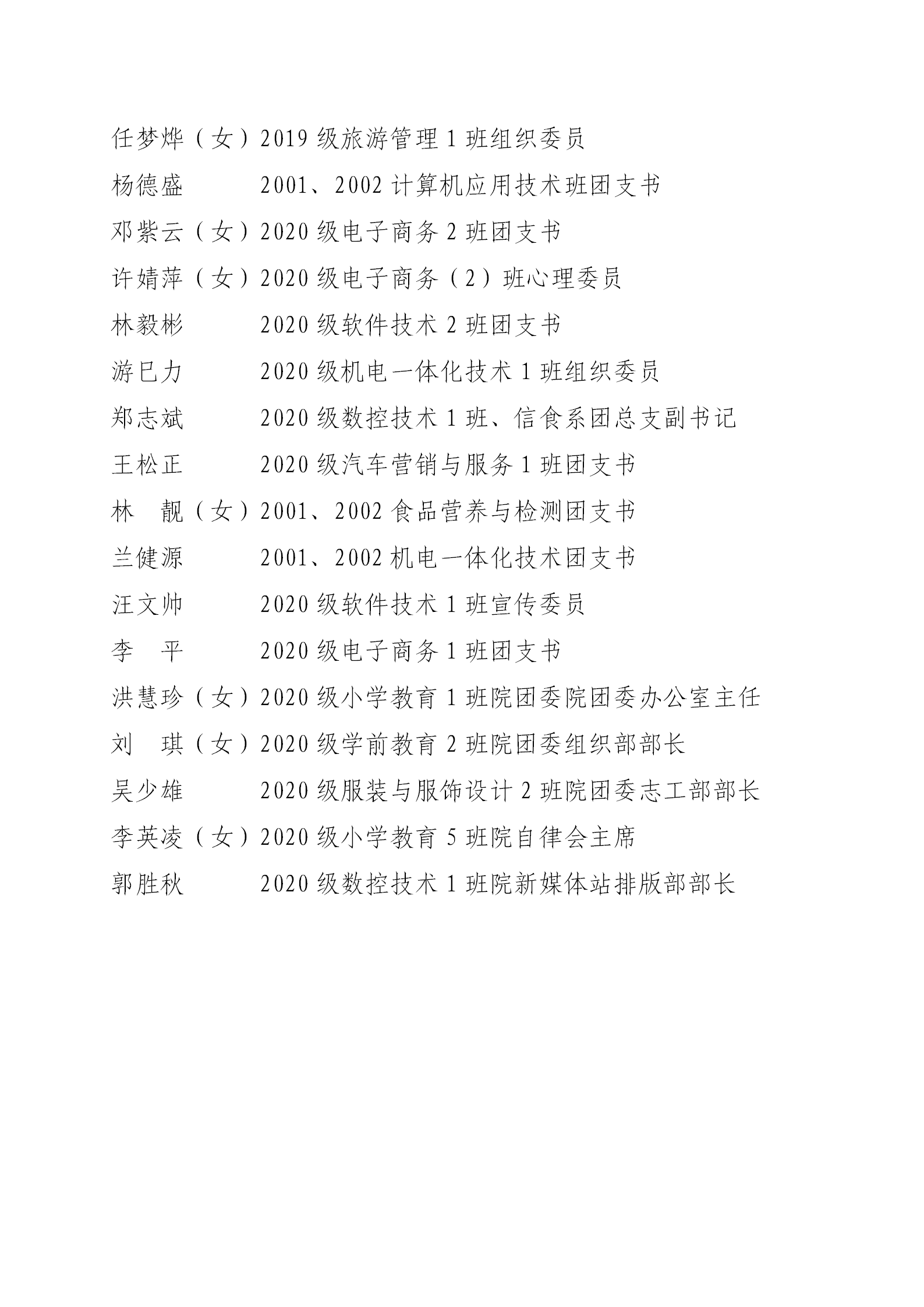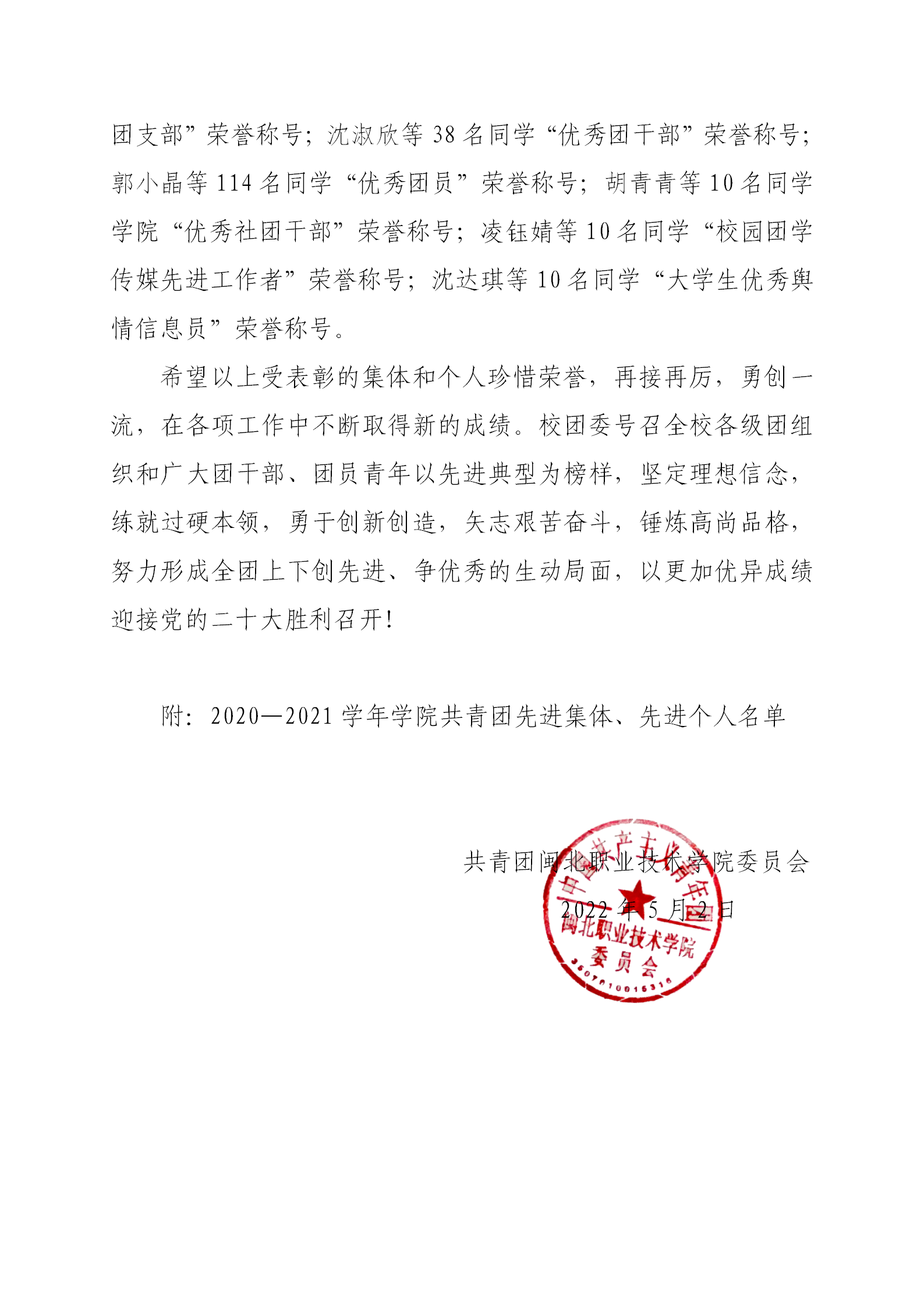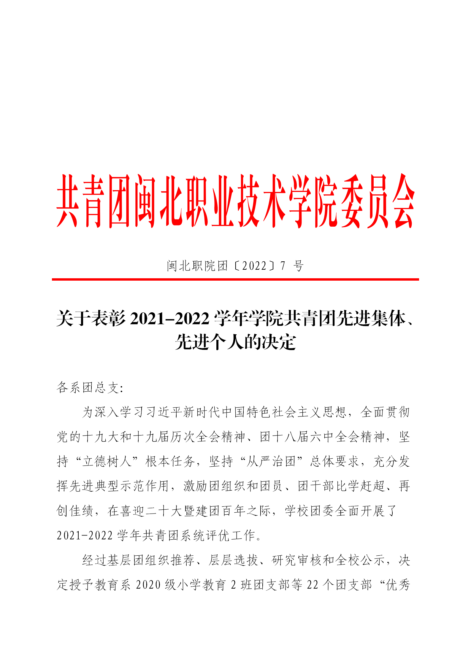 关于表彰2021-2022学年学院共青团先进集体、先进个人的决定(闽北职院团〔2022〕7号)