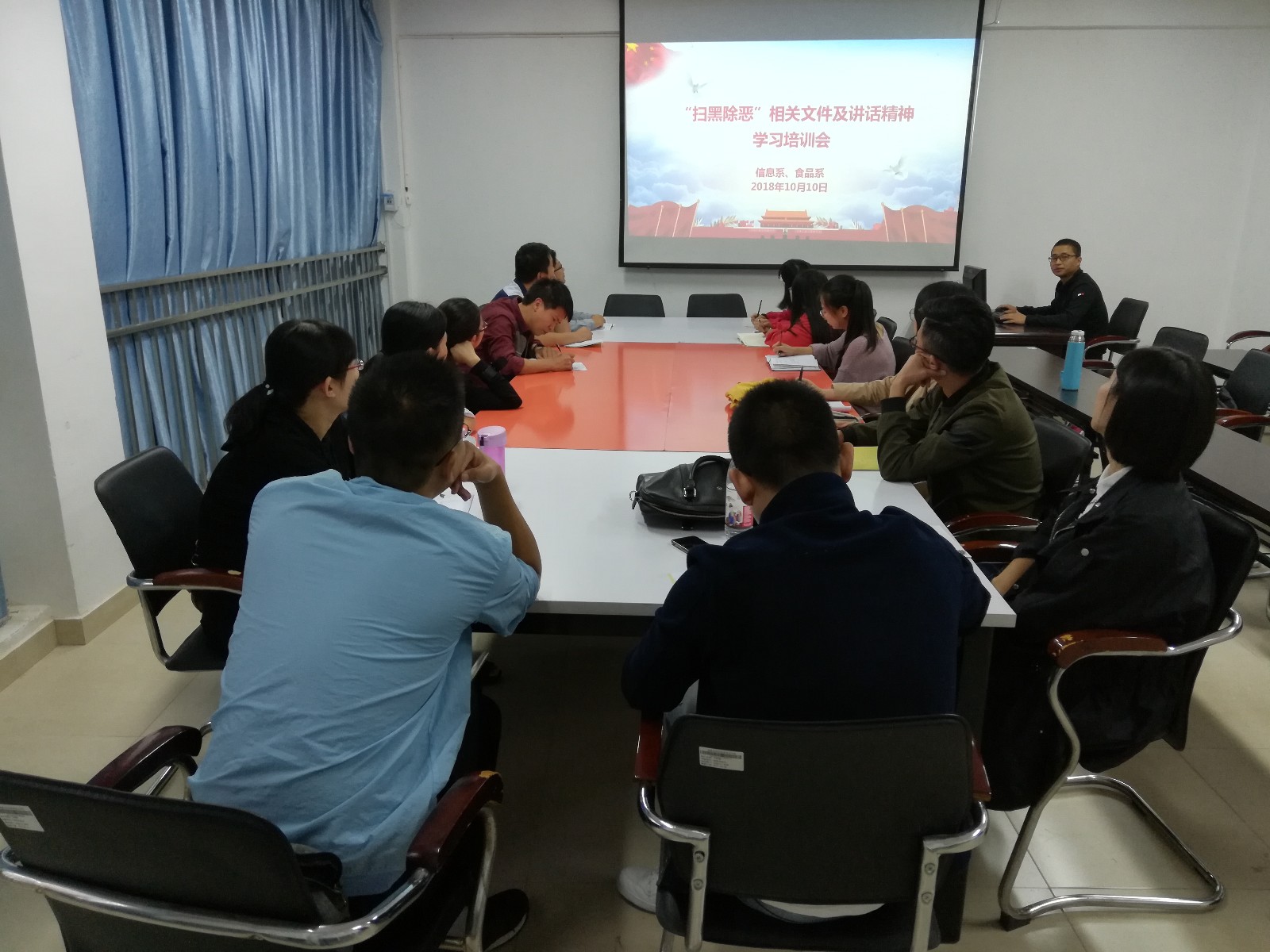 2018年10月10日下午,我系在行政楼407室召开学习“扫黑除恶”相关文件及讲话精神学习培训会,本次会议由胡建辉老师主持,我系辅导员、班主任参加了此次会议。