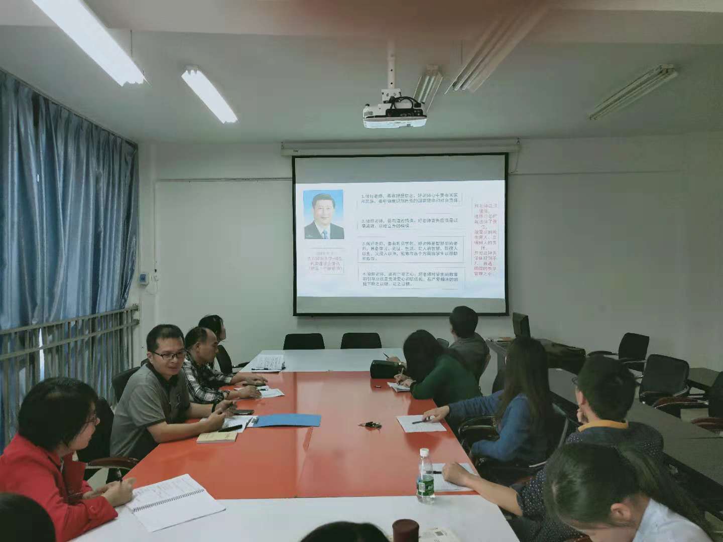 张主任从“温故”、“原文再学习”、“贯彻落实”三个维度再次带领党员同志学习习近平新时代中国特色社会主义思想。课上,张主任号召大家要发扬实干精神,不图虚名、不务虚功,要以“踏石留印、抓铁有痕”的劲头干出成效,做新时代“四好教师”。