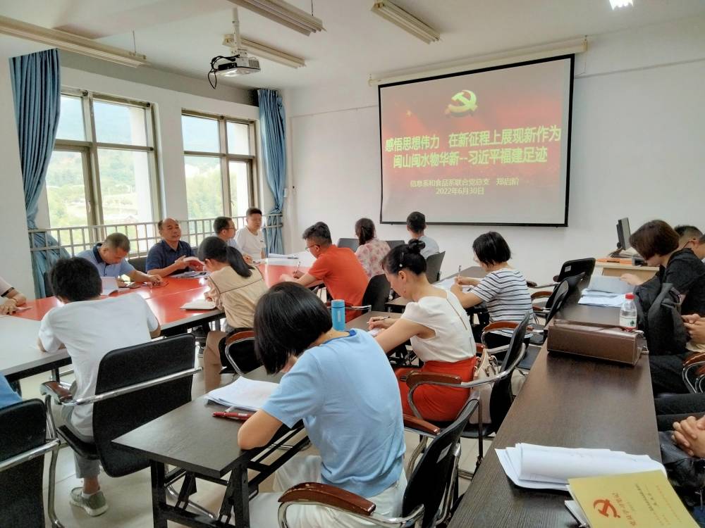 为追寻领袖足迹,感悟思想伟力,信息系和食品系联合党总支于6月30日上午在行政楼407会议室开展题为“感悟思想伟力,在新征程上展现新作为,《 闽山闽水物华新——习近平福建足迹》”学习的专题党课。全体党员参与党课学习,党课由党总支书记郑启阶主讲。