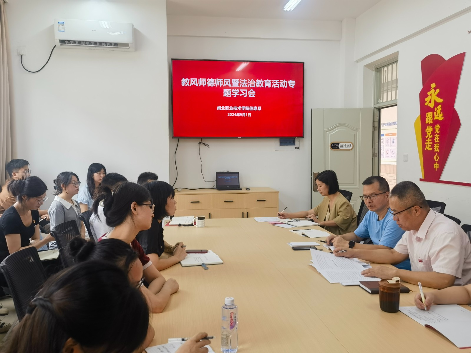 为弘扬教育家精神,加强教师思想政治工作,推动学院新学期工作平稳开局👴🏼,2024年9月1日下午🦶🏽,信息系在3号教学楼407会议室召开召开教风师德师风暨法治教育活动专题学习会🧑🏻🔧,会议由信息系党总支书记鞠建恩主持,信息系全体教职工参加会议。