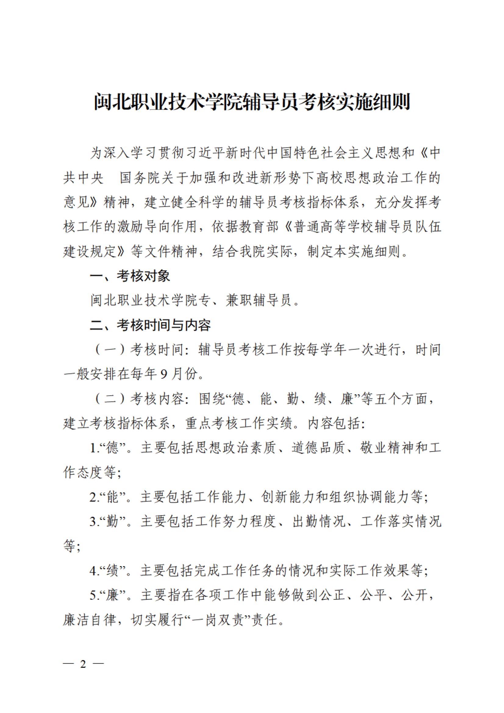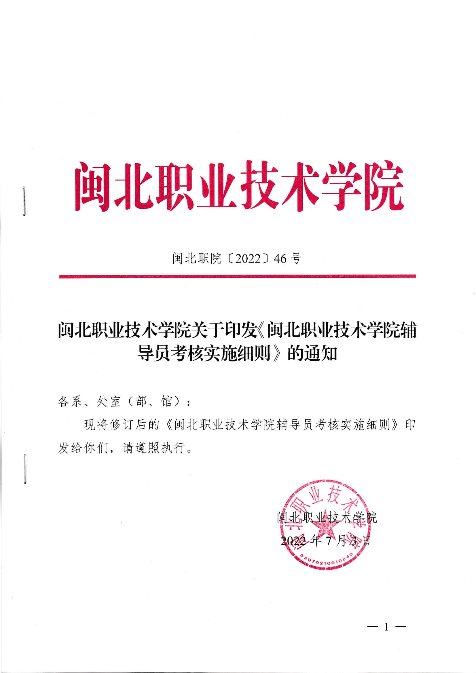 彩神关于印发《彩神辅导员考核实施细则》的通知(闽北职院〔2022〕46号)