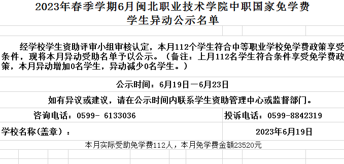 2023年春季学期6月彩神中职国家免学费 学生异动公示名单