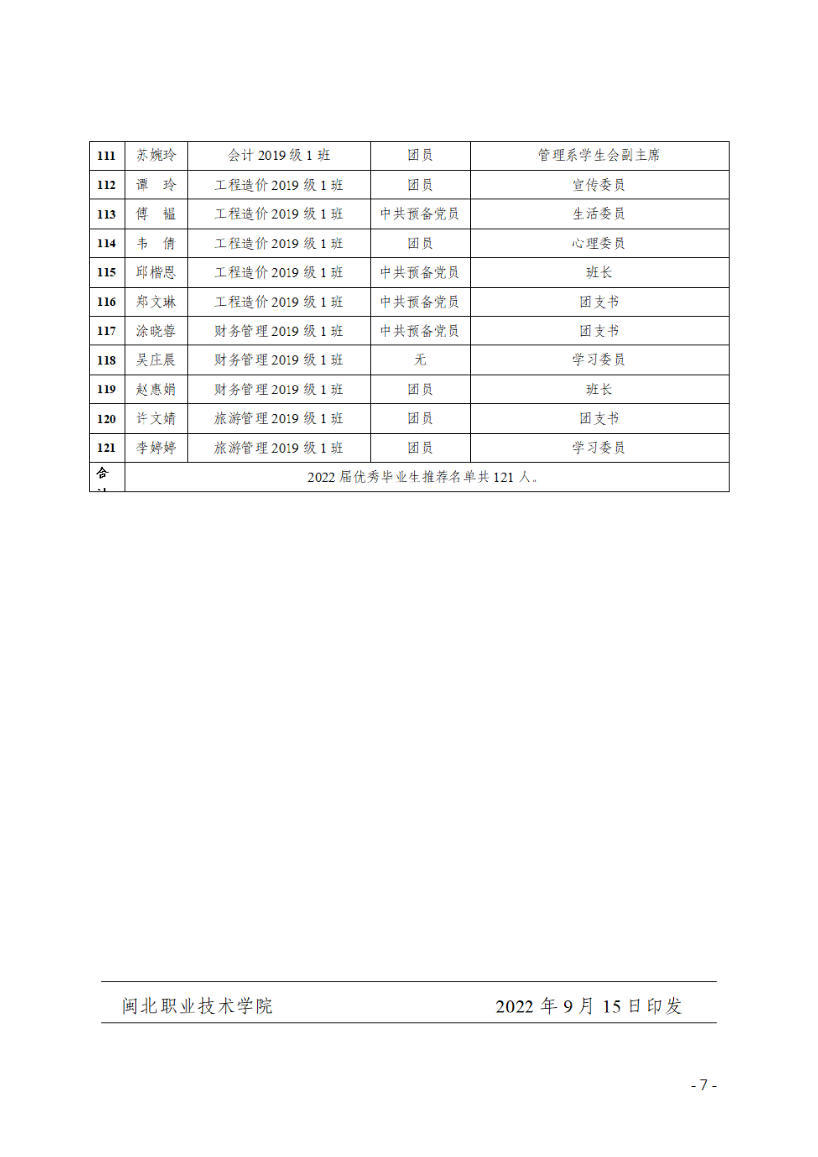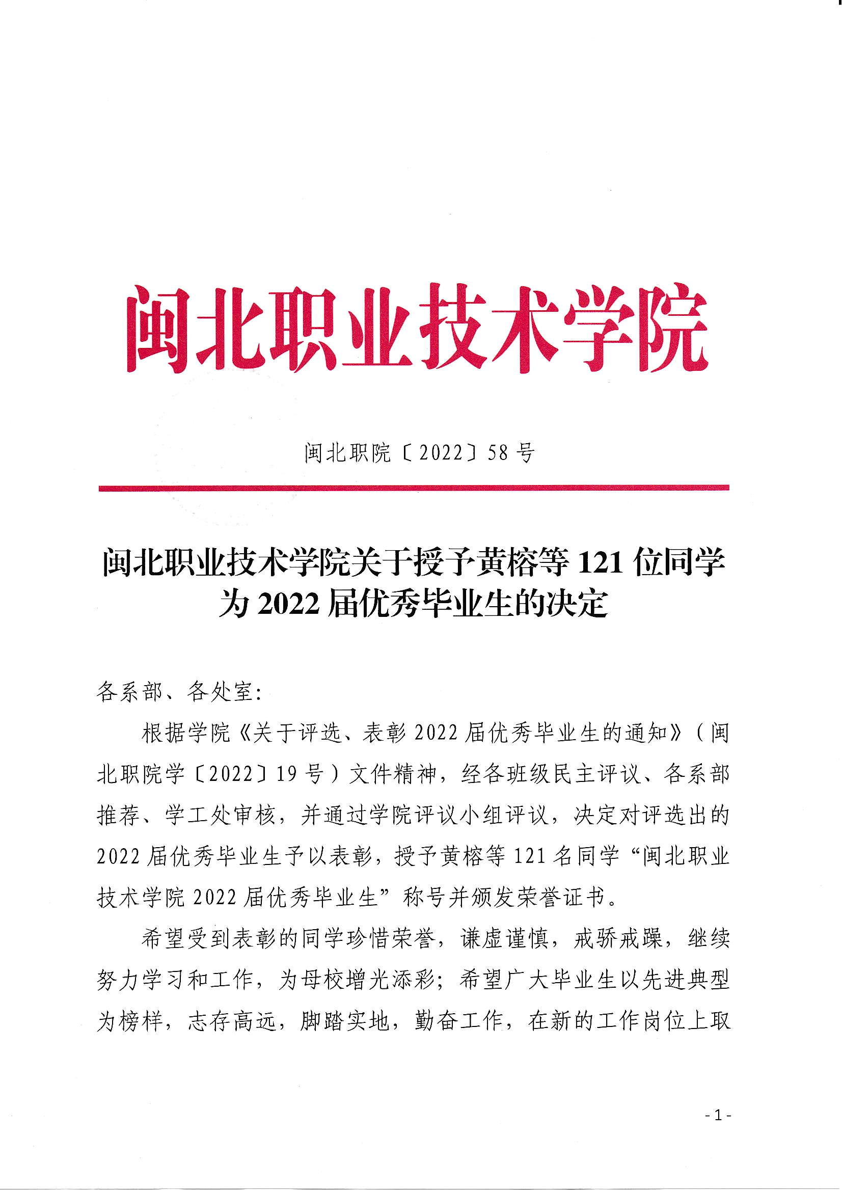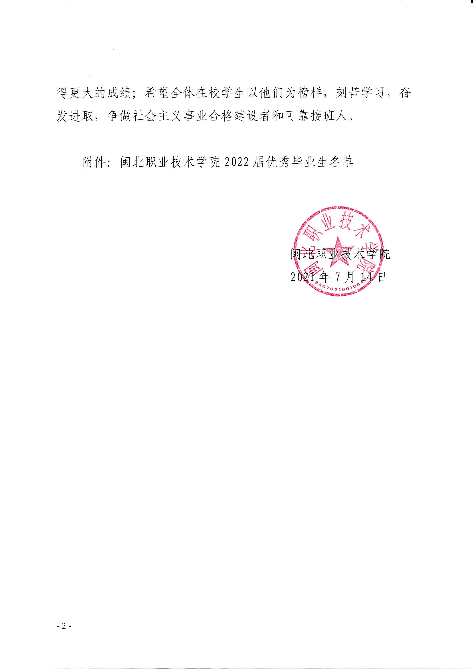 闽北职院关于授予黄榕等121位同学为2022届优秀毕业生的决定