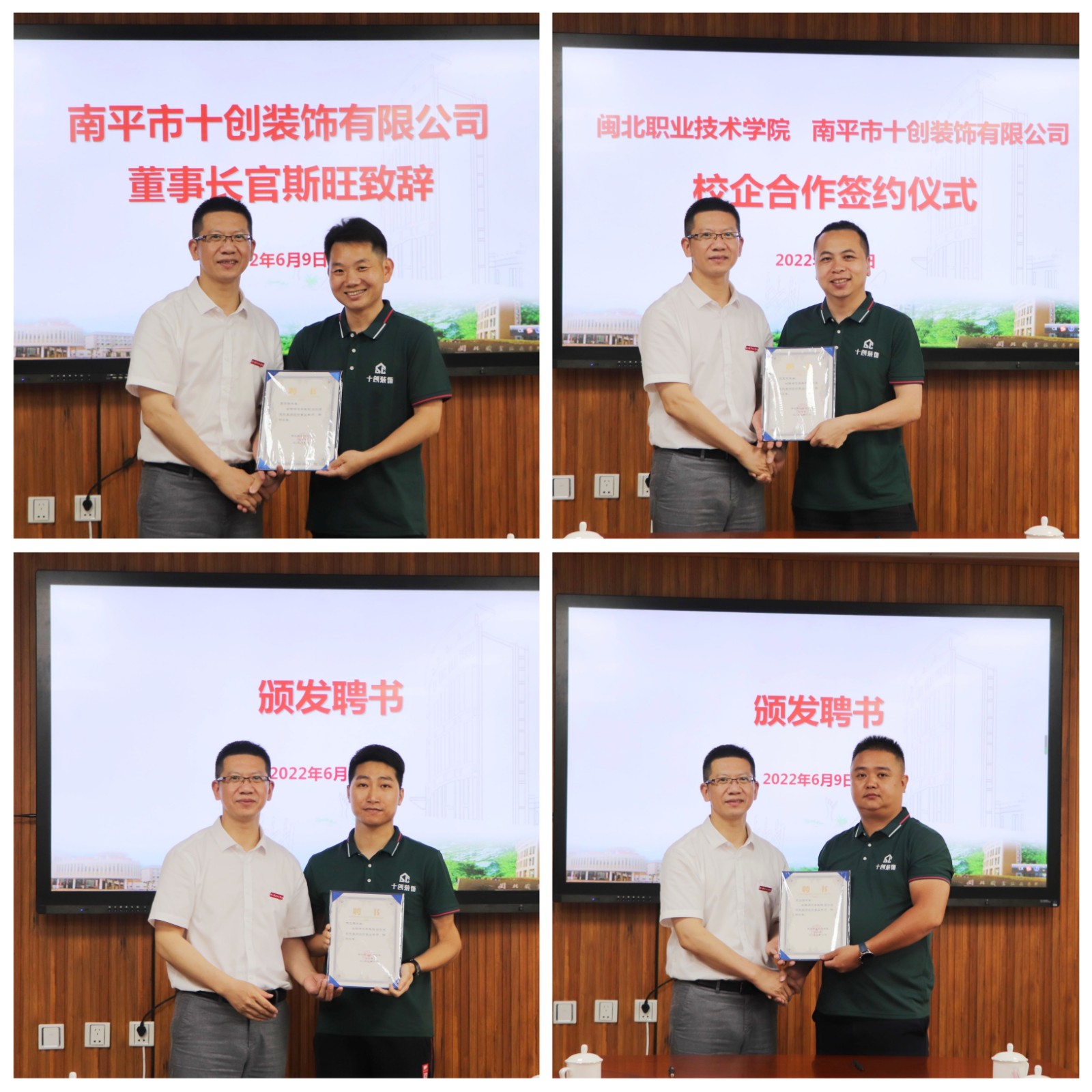 2022年6月9日下午,彩神与南平市十创装饰有限公司举行校企合作签约暨发放企业兼职教师聘书仪式。学院院长叶世森、副院长郑需勇、设计系和管理系主任陈婷、招生就业处副处长詹永珍等专业教师,南平市十创装饰有限公司董事长官斯旺、集团总经理连兆华、材料总监傅明炳、文化总监郑加勇等校企代表出席仪式。