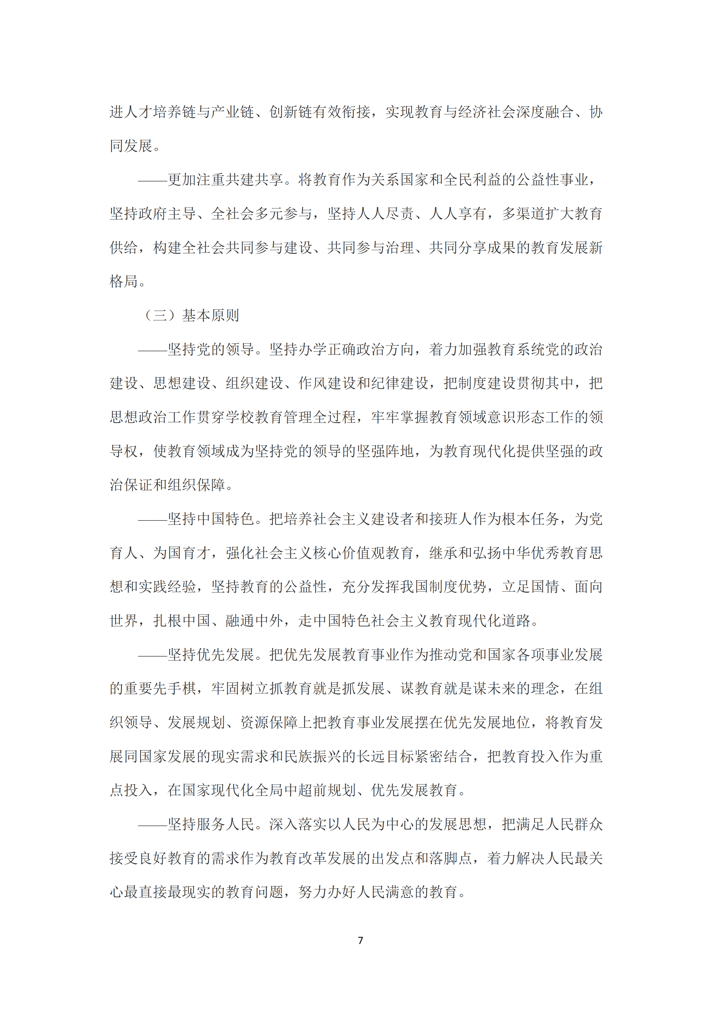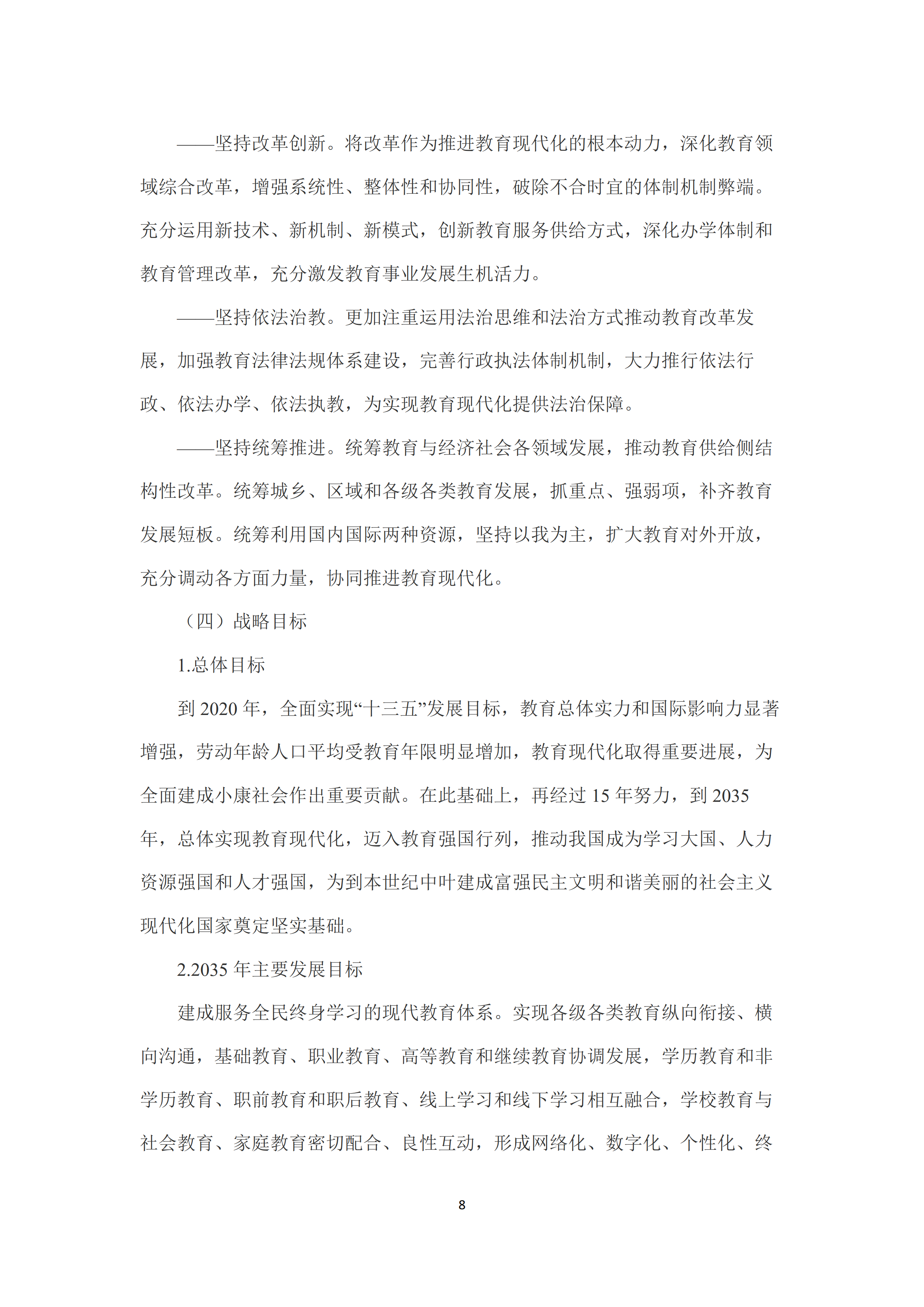 《中国教育现代化2035》提出了推进教育现代化的八大基本理念:更加注重以德为先👳🏼🖱,更加注重全面发展🥧,更加注重面向人人😊🥨,更加注重终身学习👩‍🦼‍➡️,更加注重因材施教,更加注重知行合一,更加注重融合发展,更加注重共建共享。明确了推进教育现代化的基本原则:坚持党的领导、坚持中国特色、坚持优先发展👐、坚持服务人民、坚持改革创新、坚持依法治教📈、坚持统筹推进。