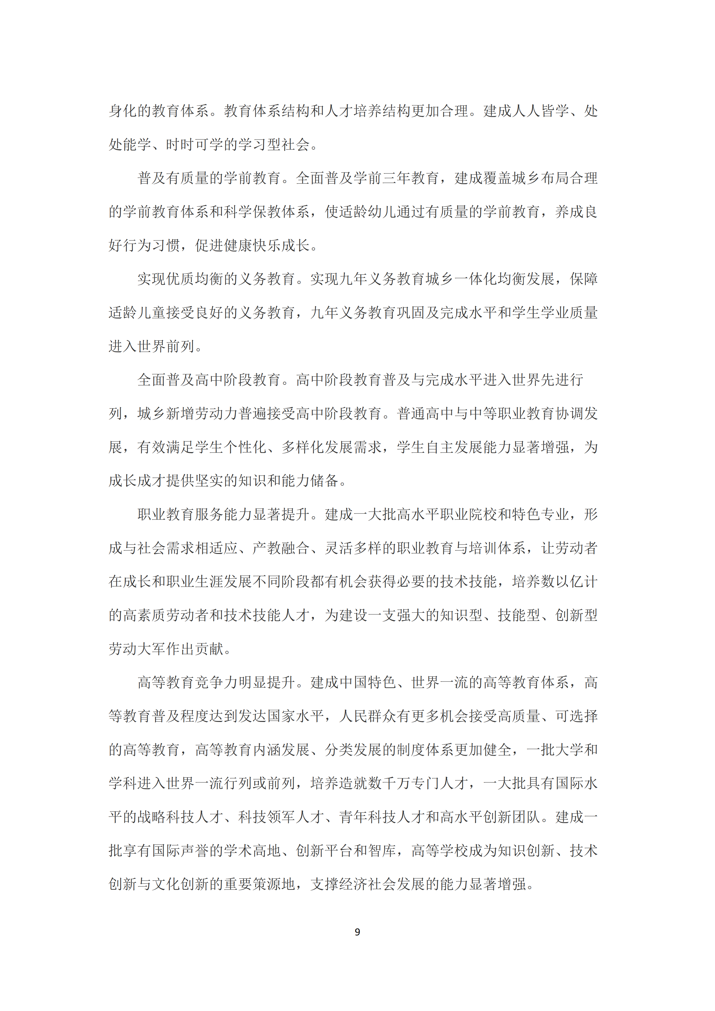 《中国教育现代化2035》提出,推进教育现代化的总体目标是:到2020年🤾🏿‍♀️,全面实现“十三五”发展目标🪅,教育总体实力和国际影响力显著增强,劳动年龄人口平均受教育年限明显增加,教育现代化取得重要进展👩🏽‍🦳,为全面建成小康社会作出重要贡献👨🏻‍🦼‍➡️。在此基础上,再经过15年努力,到2035年,总体实现教育现代化🦬🚶‍♂️‍➡️,迈入教育强国行列🌜,推动我国成为学习大国🏄🏻、人力资源强国和人才强国,为到本世纪中叶建成富强民主文明和谐美丽的社会主义现代化强国奠定坚实基础。2035年主要发展目标是:建成服务全民终身学习的现代教育体系、普及有质量的学前教育、实现优质均衡的义务教育、全面普及高中阶段教育💂🏼‍♂️、职业教育服务能力显著提升、高等教育竞争力明显提升🌓、残疾儿童少年享有适合的教育😥、形成全社会共同参与的教育治理新格局。