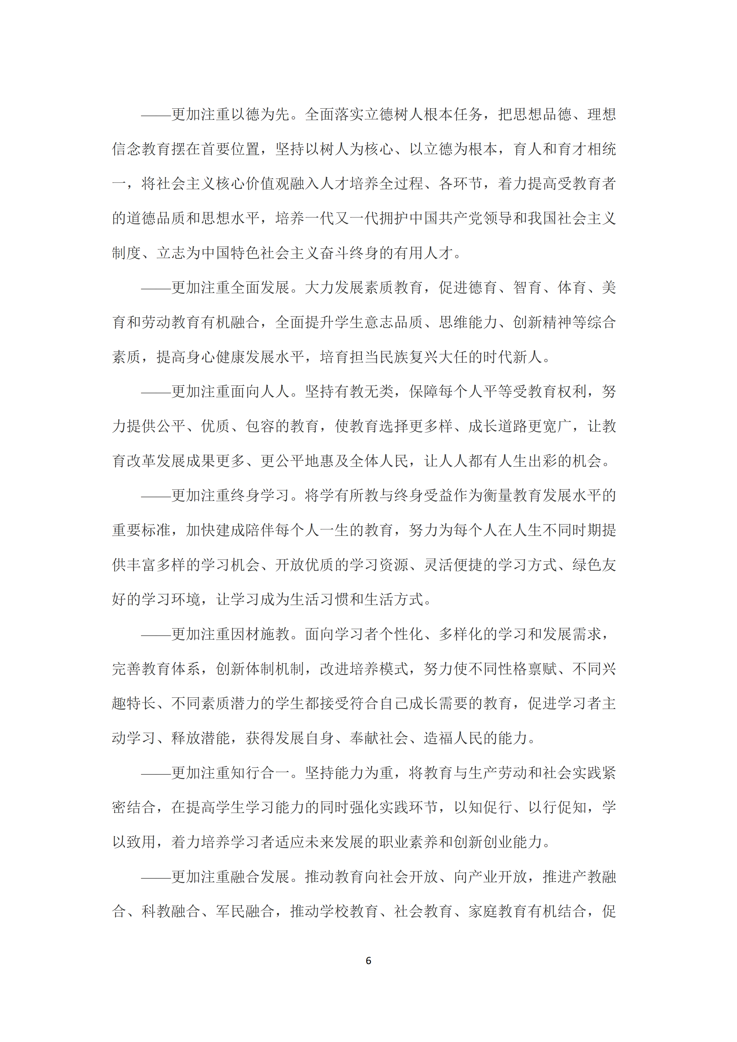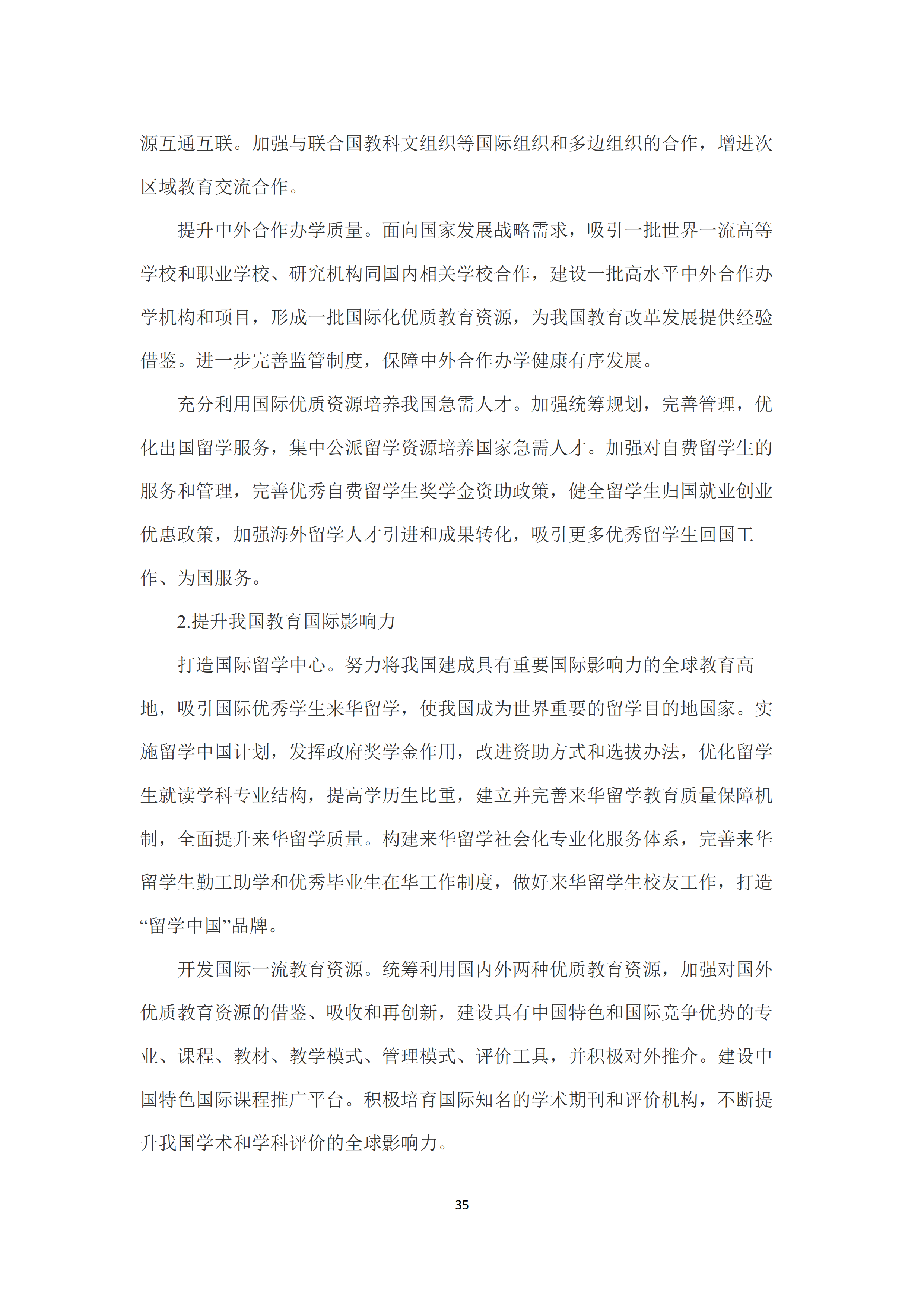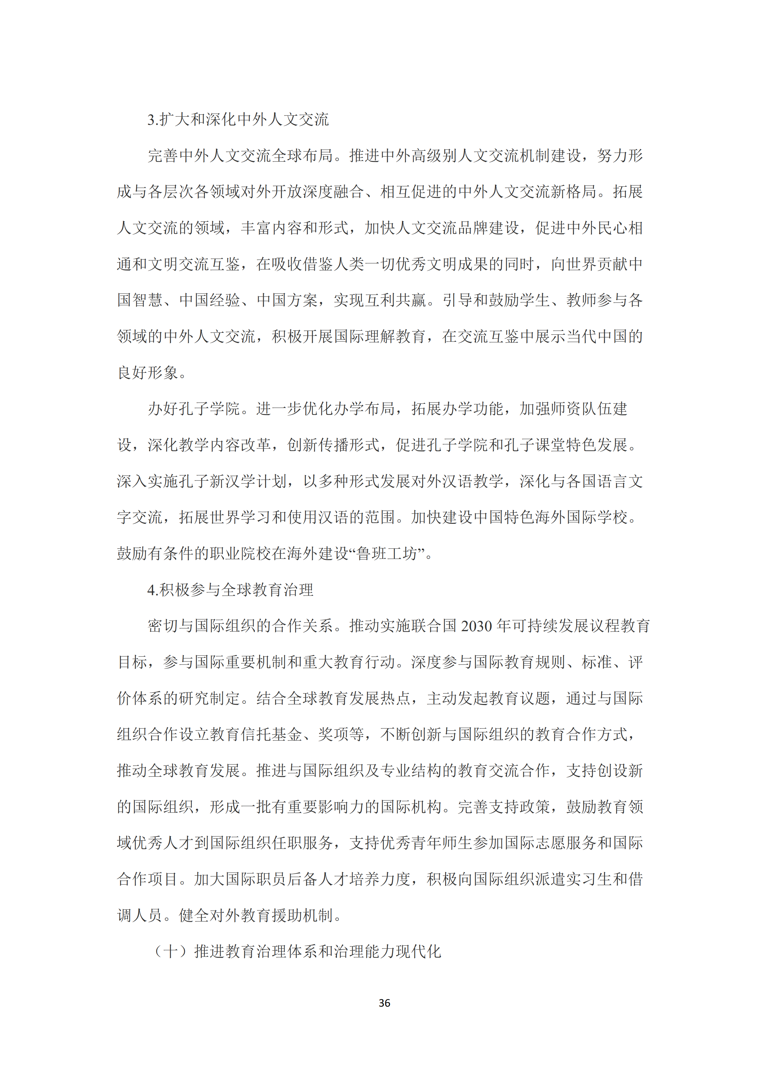 九是开创教育对外开放新格局。全面提升国际交流合作水平,推动我国同其他国家学历学位互认🫳🏽、标准互通👩‍🦲、经验互鉴🧗🏿‍♂️。扎实推进“一带一路”教育行动🟫🔳。加强与联合国教科文组织等国际组织和多边组织的合作。提升中外合作办学质量🧚🏽‍♂️。优化出国留学服务。实施留学中国计划🏃‍♂️‍➡️,建立并完善来华留学教育质量保障机制📝🫃,全面提升来华留学质量。推进中外高级别人文交流机制建设,拓展人文交流领域,促进中外民心相通和文明交流互鉴♚。促进孔子学院和孔子课堂特色发展。加快建设中国特色海外国际学校🫰🏽🙎。鼓励有条件的职业院校在海外建设“鲁班工坊”✊🏽。积极参与全球教育治理🤸🏽,深度参与国际教育规则💆🏻‍♀️、标准🈂️⏲、评价体系的研究制定。推进与国际组织及专业机构的教育交流合作👨🏼‍🎤。健全对外教育援助机制🤼‍♀️。