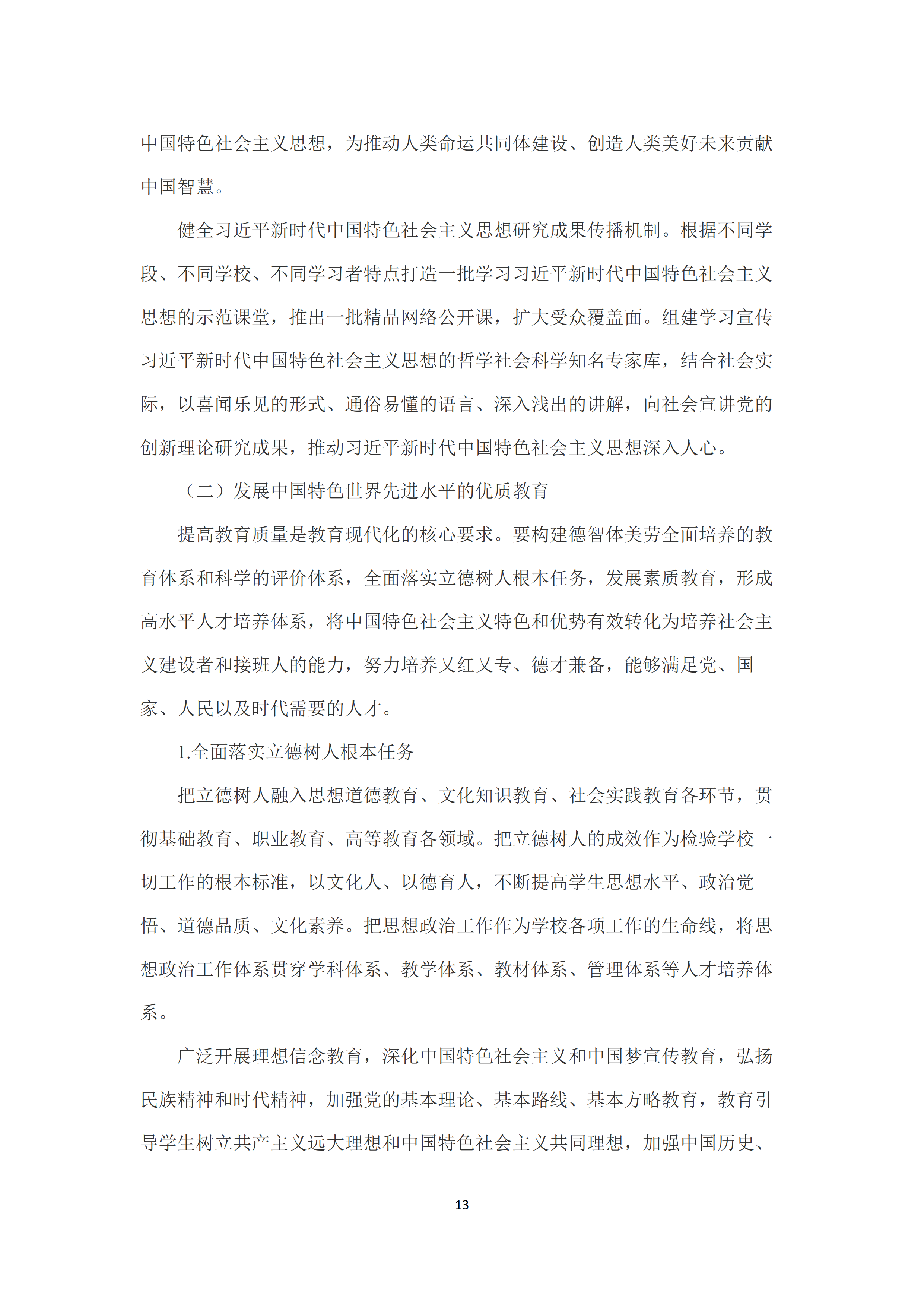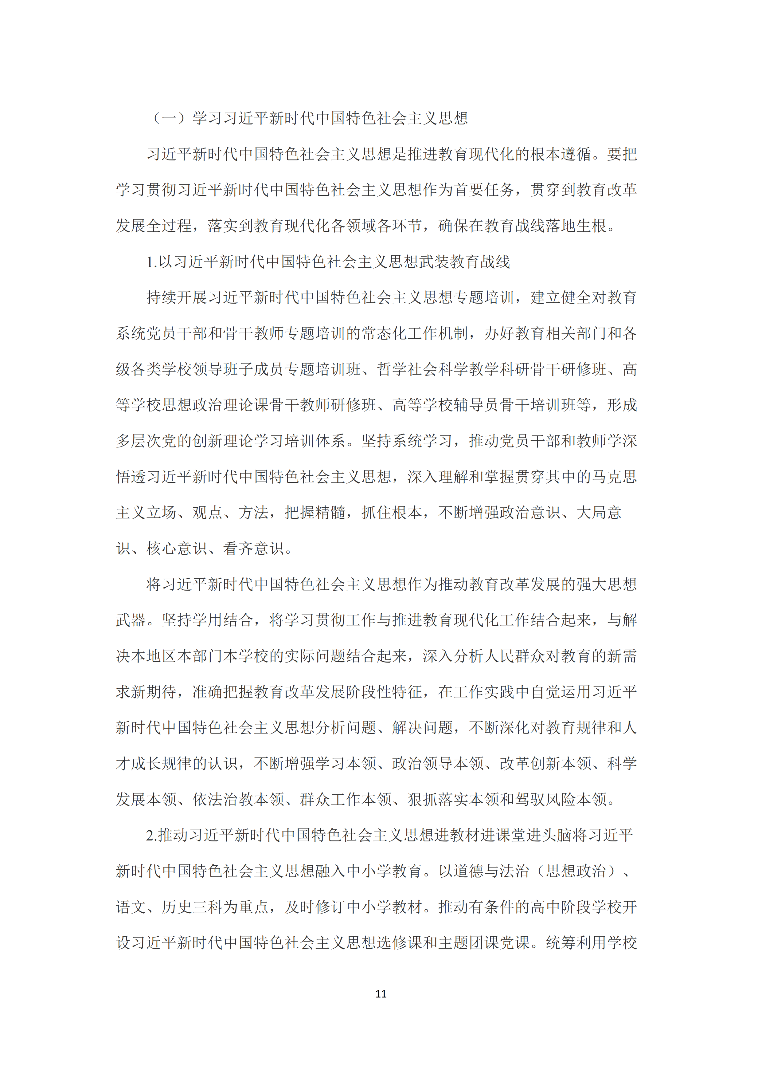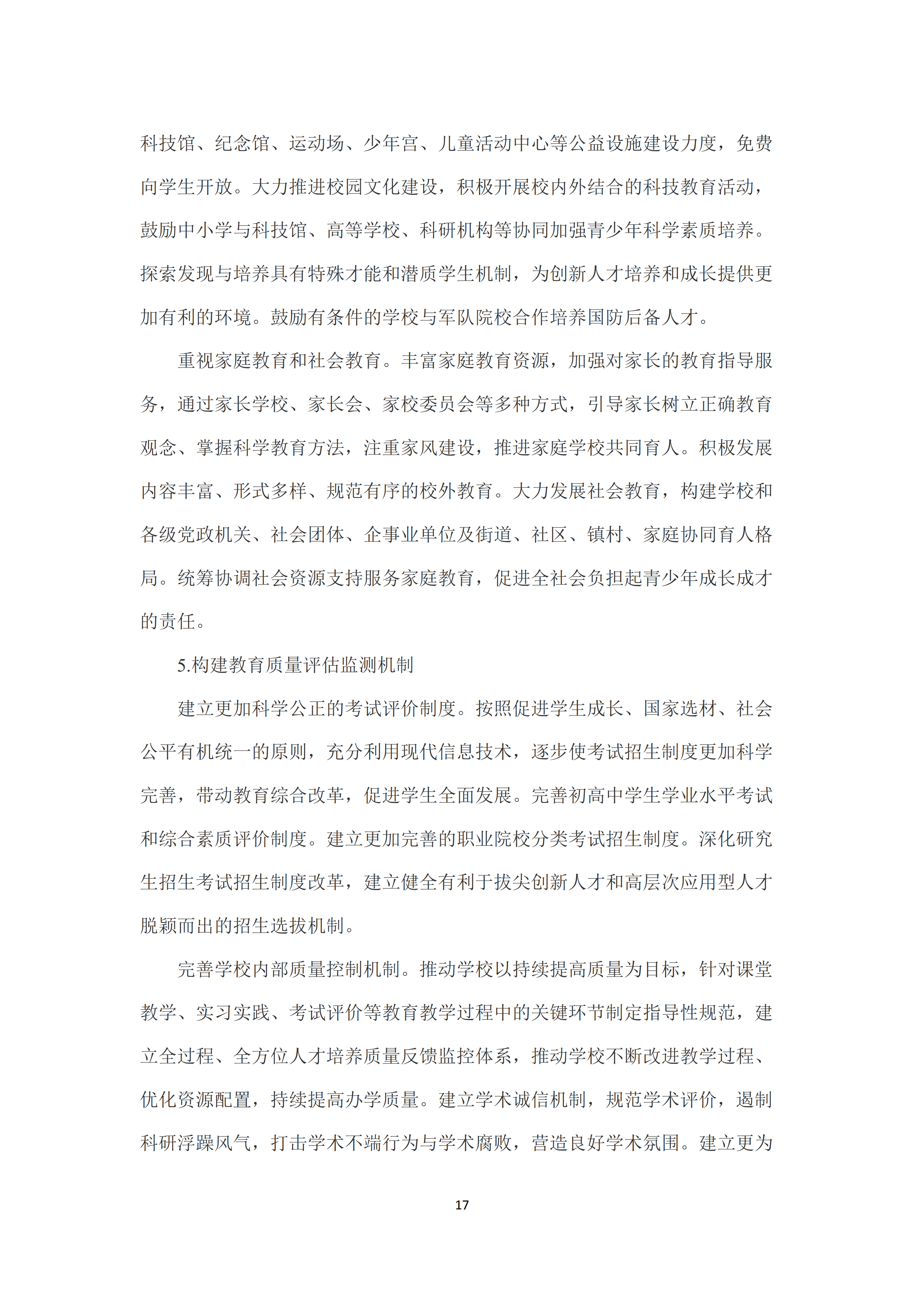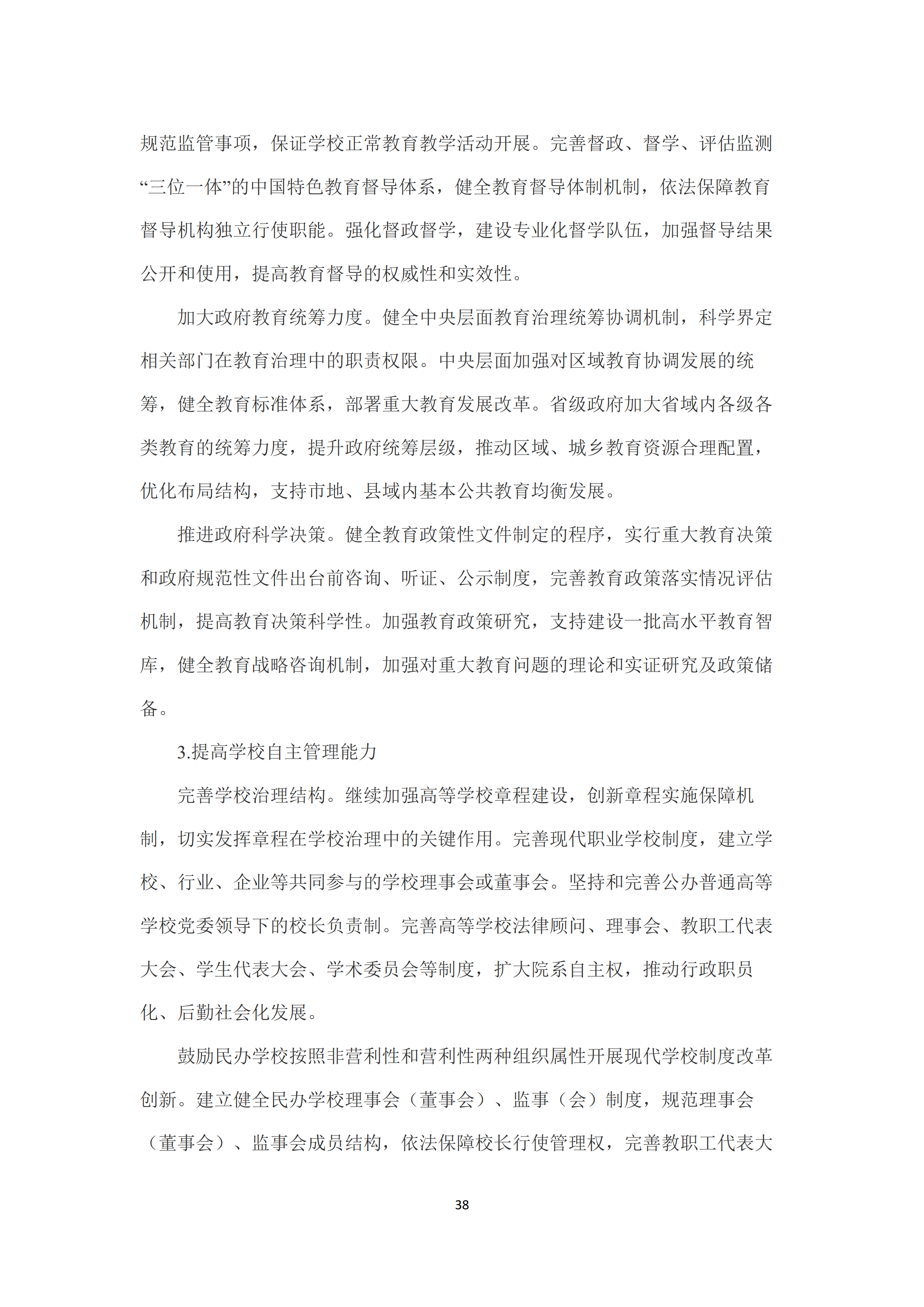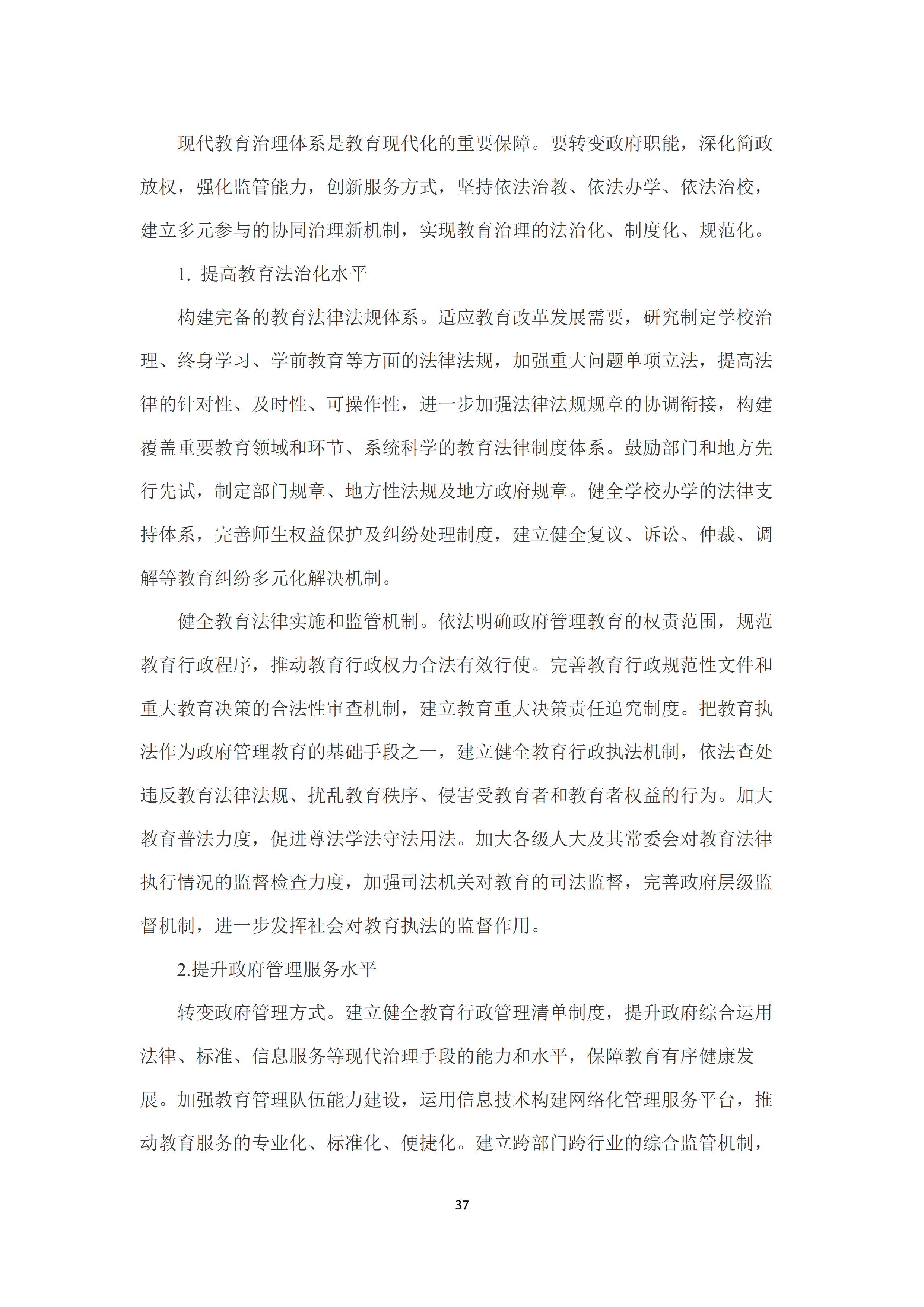 十是推进教育治理体系和治理能力现代化。提高教育法治化水平,构建完备的教育法律法规体系👩🏿‍🔬,健全学校办学法律支持体系👩🏻‍🦰。健全教育法律实施和监管机制🥐。提升政府管理服务水平🛠🔷,提升政府综合运用法律🖐🏽、标准、信息服务等现代治理手段的能力和水平。健全教育督导体制机制,提高教育督导的权威性和实效性👷。提高学校自主管理能力🚵🏽‍♂️,完善学校治理结构,继续加强高等学校章程建设🤞。鼓励民办学校按照非营利性和营利性两种组织属性开展现代学校制度改革创新。推动社会参与教育治理常态化,建立健全社会参与学校管理和教育评价监管机制。