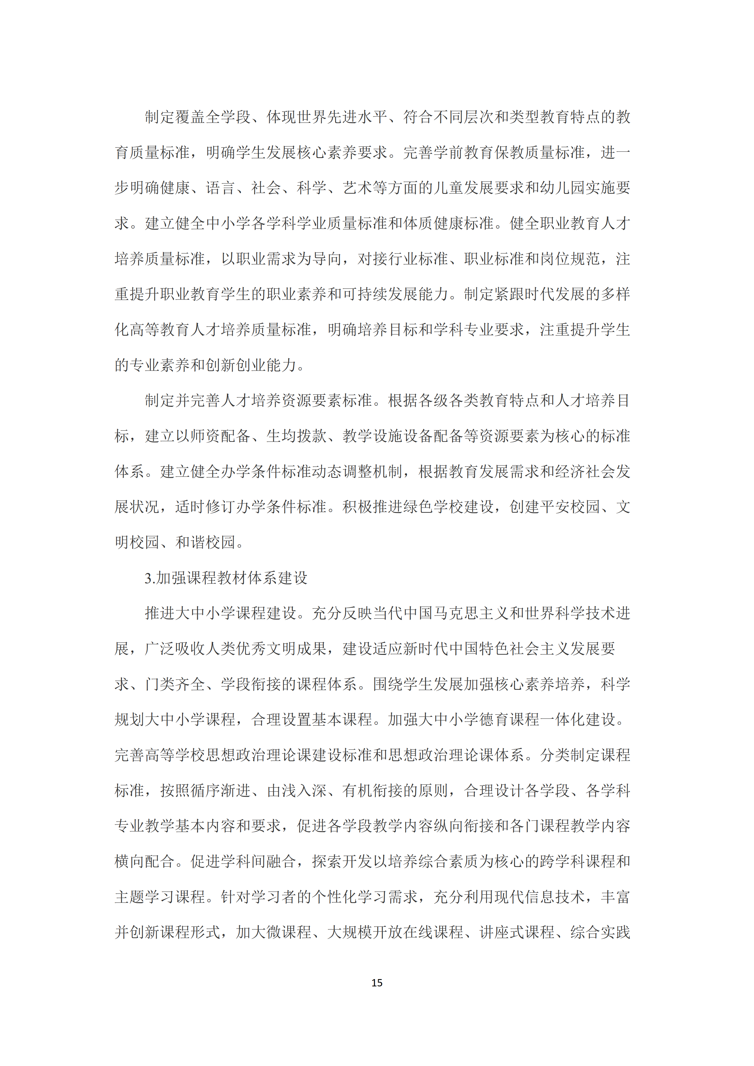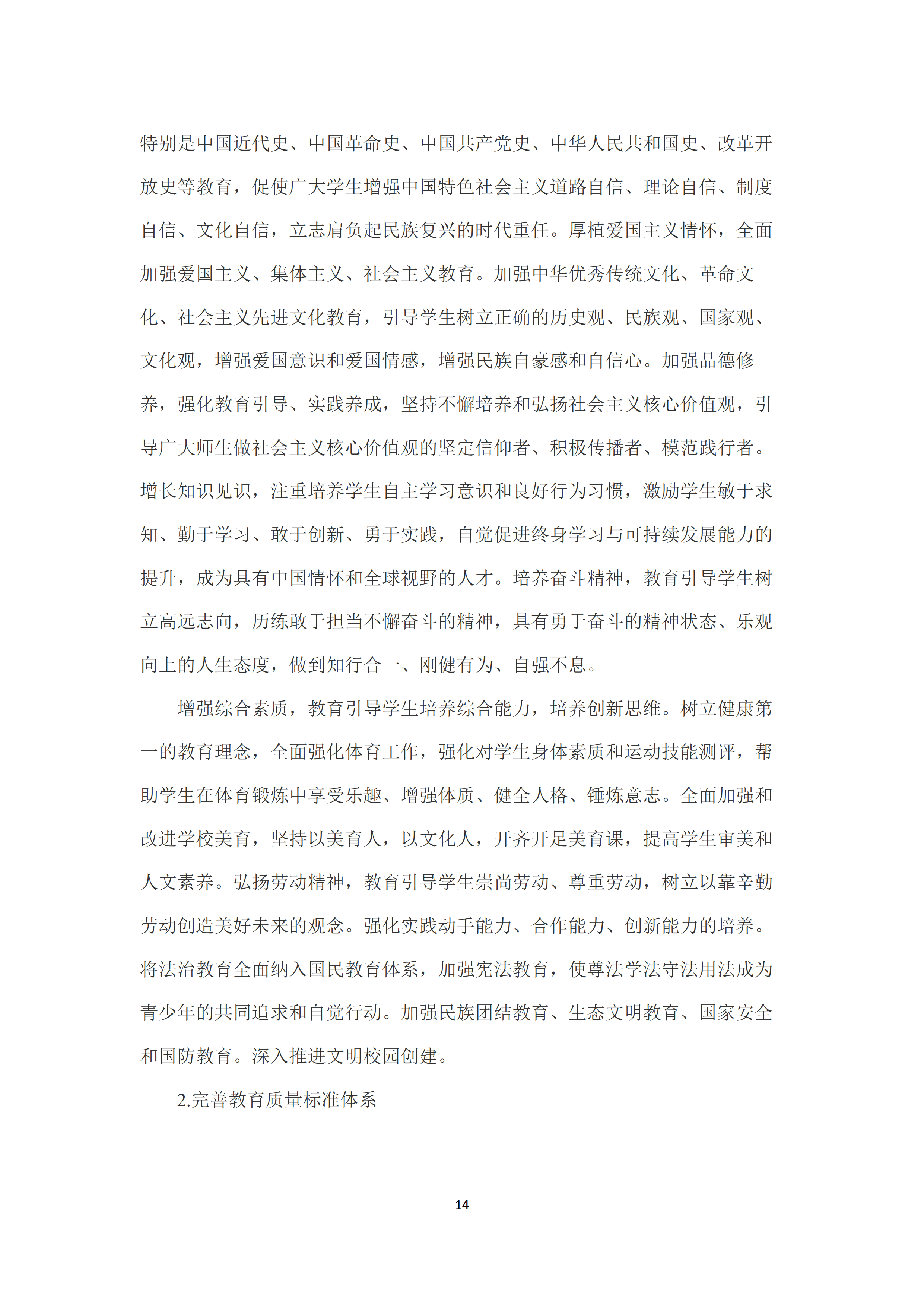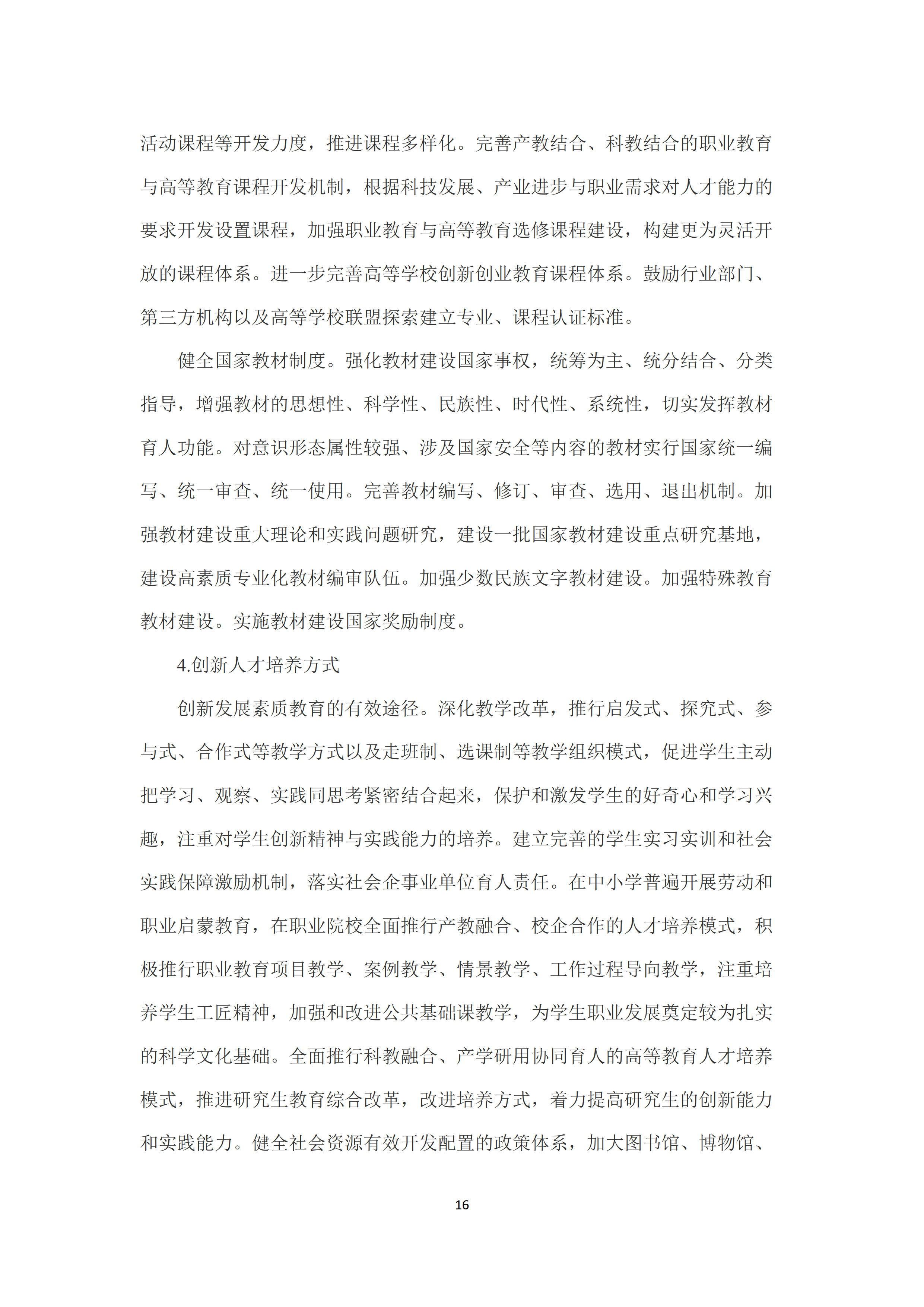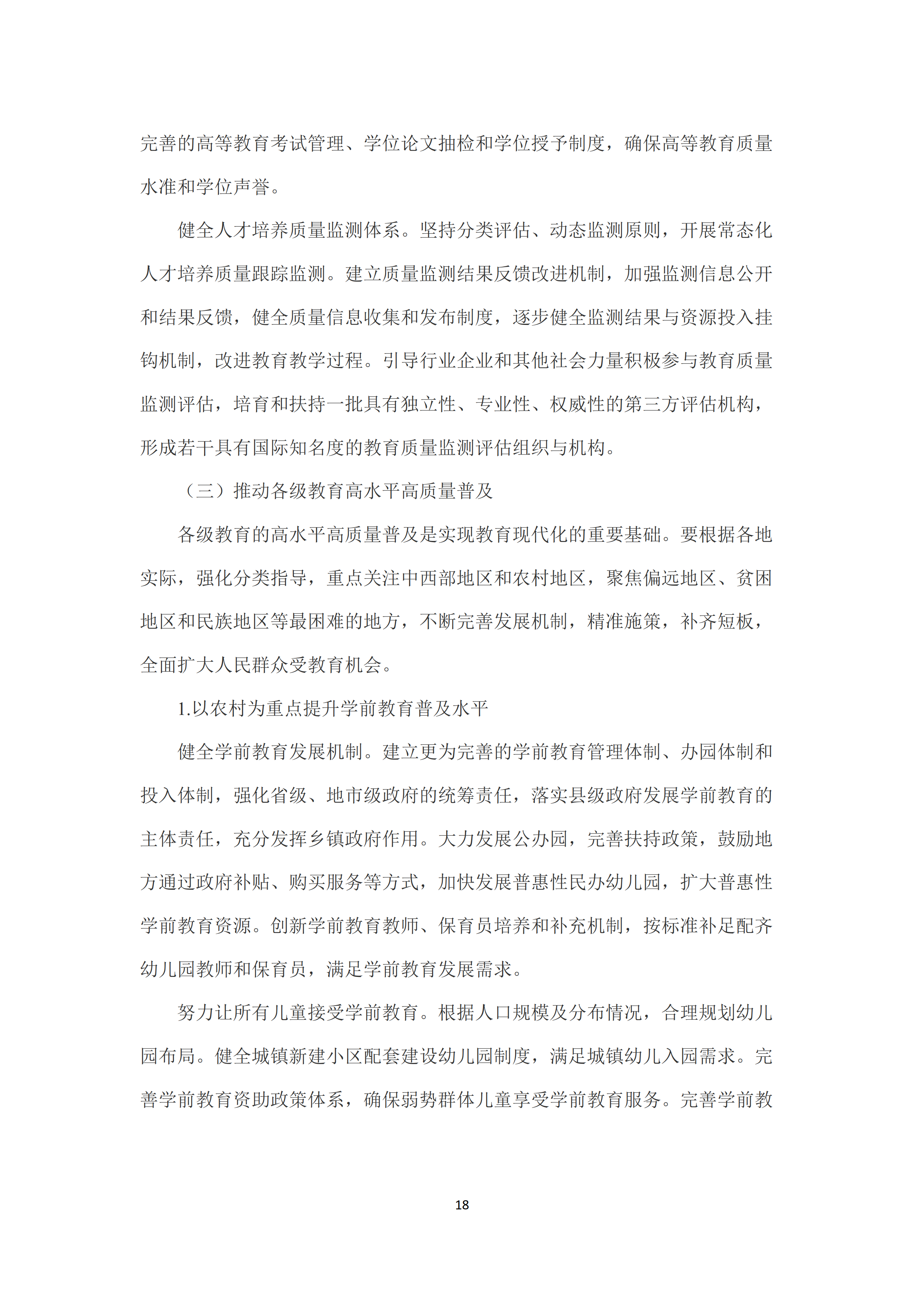 二是发展中国特色世界先进水平的优质教育🧜🏻。全面落实立德树人根本任务👨🏿‍🎓,广泛开展理想信念教育👨🏻‍🍼,厚植爱国主义情怀🙆🏽‍♀️,加强品德修养,增长知识见识,培养奋斗精神🪦,不断提高学生思想水平、政治觉悟、道德品质、文化素养。增强综合素质🧘🏿‍♂️,树立健康第一的教育理念,全面强化学校体育工作,全面加强和改进学校美育🧖🏽‍♂️,弘扬劳动精神🤷,强化实践动手能力👨🏿‍🍼、合作能力🚬、创新能力的培养。完善教育质量标准体系,制定覆盖全学段👸🏻、体现世界先进水平、符合不同层次类型教育特点的教育质量标准,明确学生发展核心素养要求🐱。完善学前教育保教质量标准。建立健全中小学各学科学业质量标准和体质健康标准。健全职业教育人才培养质量标准,制定紧跟时代发展的多样化高等教育人才培养质量标准。建立以师资配备、生均拨款、教学设施设备等资源要素为核心的标准体系和办学条件标准动态调整机制。加强课程教材体系建设,科学规划大中小学课程🤚🏼,分类制定课程标准,充分利用现代信息技术,丰富并创新课程形式🛐。健全国家教材制度,统筹为主6️⃣、统分结合、分类指导,增强教材的思想性、科学性、民族性、时代性👨‍👧‍👧、系统性,完善教材编写👩🏽‍🏫𓀜、修订🥃、审查、选用、退出机制🤲。创新人才培养方式🧙🏻‍♀️,推行启发式、探究式、参与式、合作式等教学方式以及走班制、选课制等教学组织模式,培养学生创新精神与实践能力🍶。大力推进校园文化建设👩🏿‍🦰。重视家庭教育和社会教育👡🧔🏽‍♂️。构建教育质量评估监测机制,建立更加科学公正的考试评价制度👷🏼‍♀️,建立全过程🕶𓀋、全方位人才培养质量反馈监控体系。