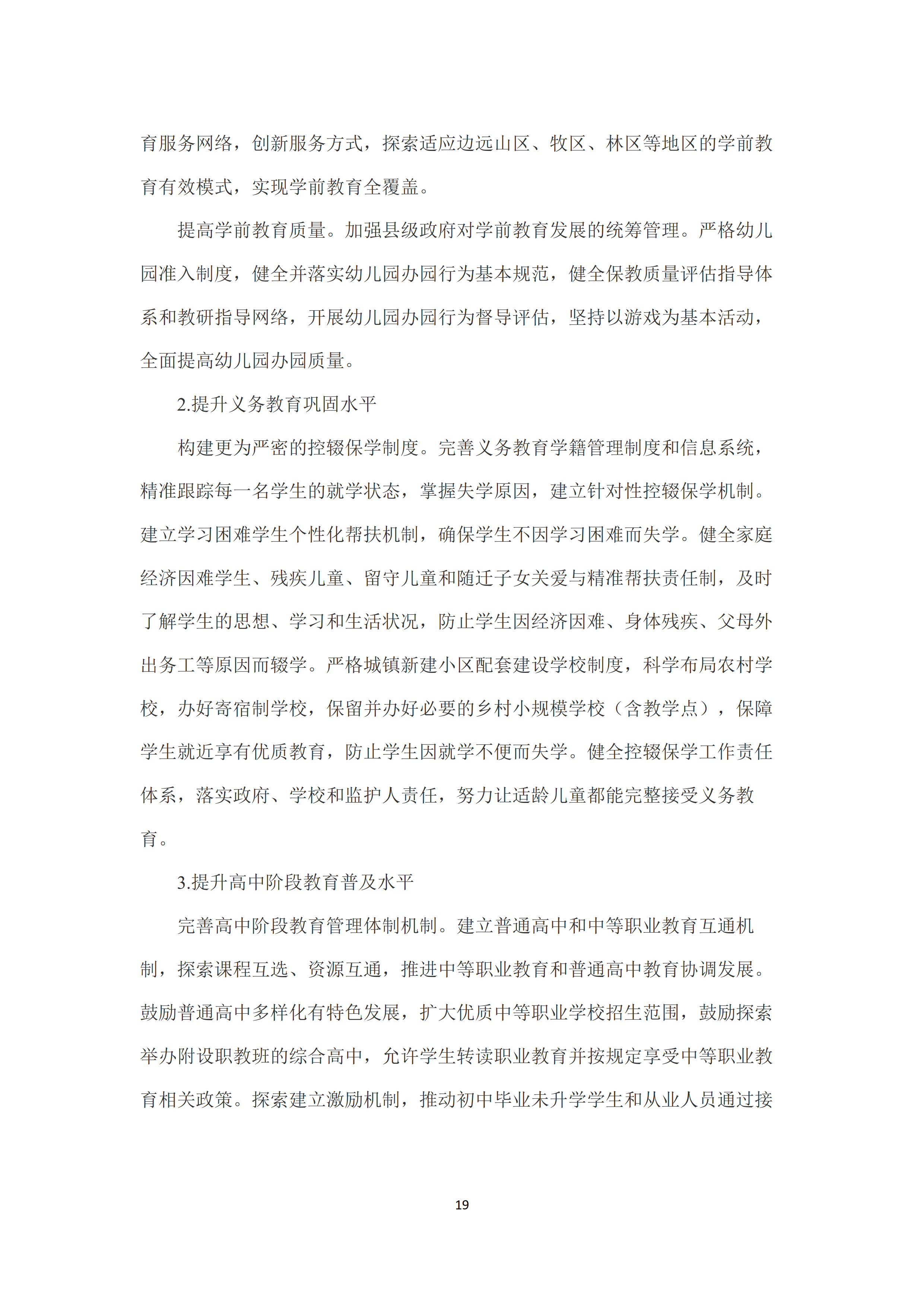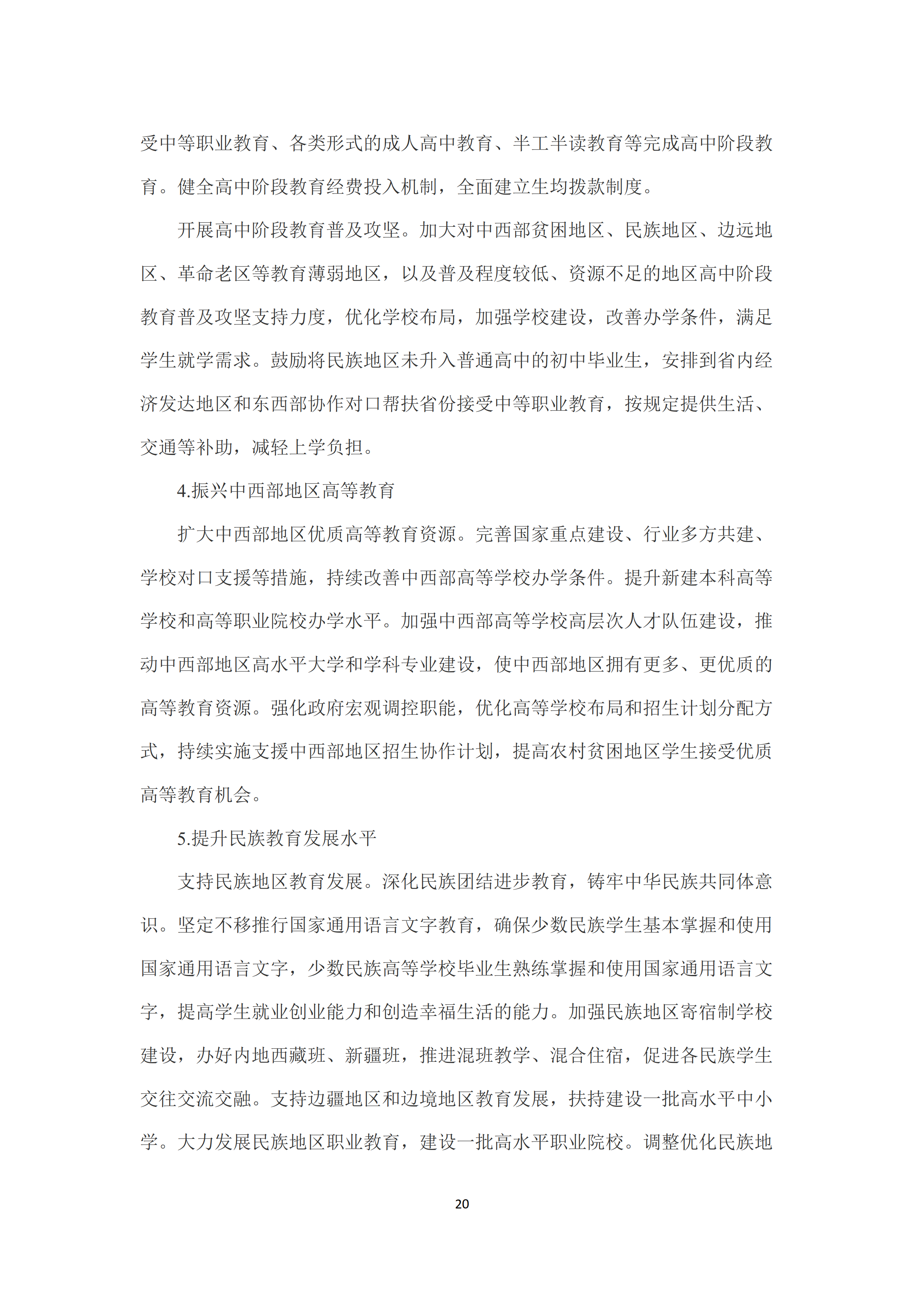 三是推动各级教育高水平高质量普及。以农村为重点提升学前教育普及水平,建立更为完善的学前教育管理体制、办园体制和投入体制🗃,大力发展公办园,加快发展普惠性民办幼儿园。提升义务教育巩固水平🧃,健全控辍保学工作责任体系。提升高中阶段教育普及水平😌,推进中等职业教育和普通高中教育协调发展📭,鼓励普通高中多样化有特色发展。振兴中西部地区高等教育。提升民族教育发展水平。