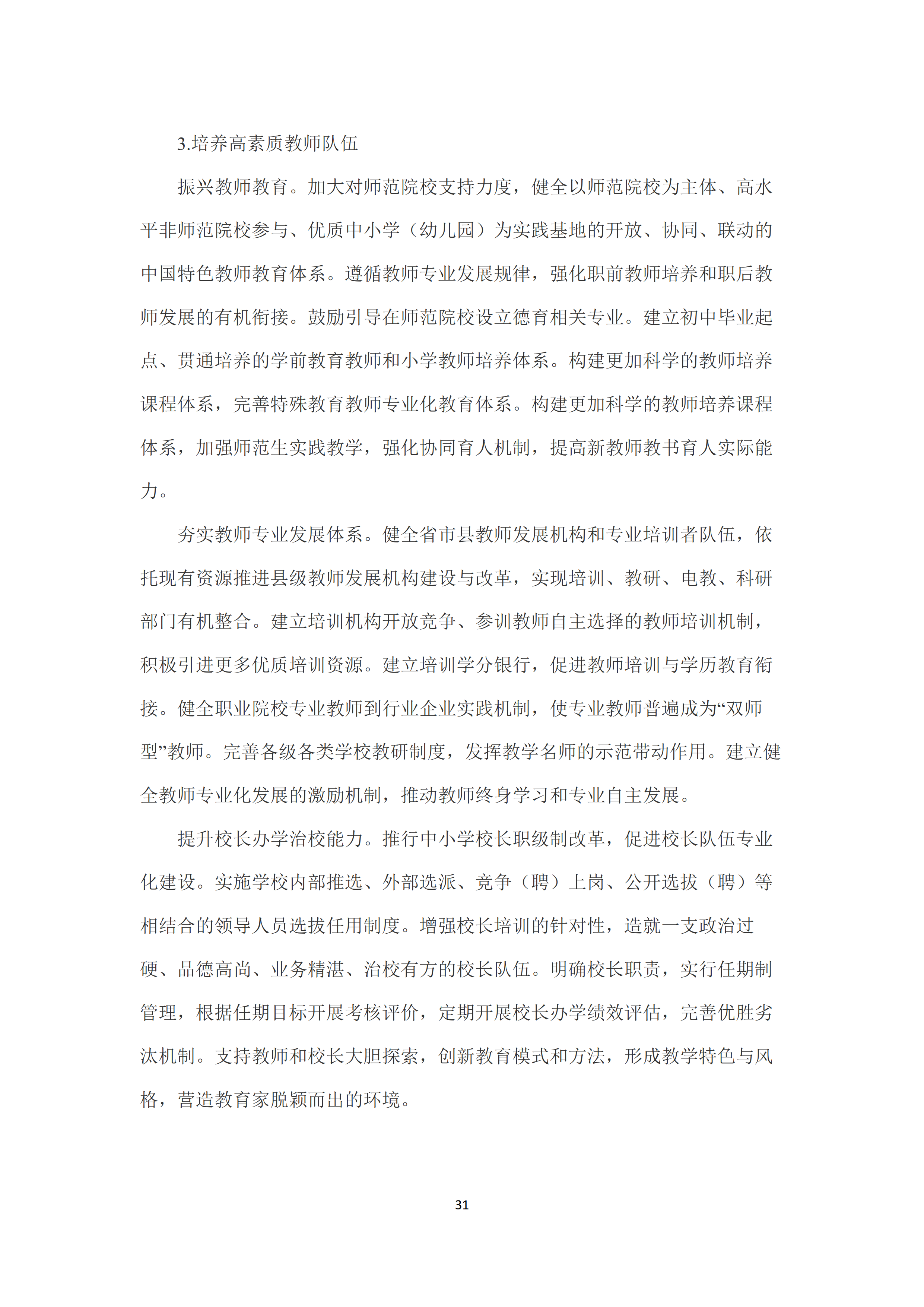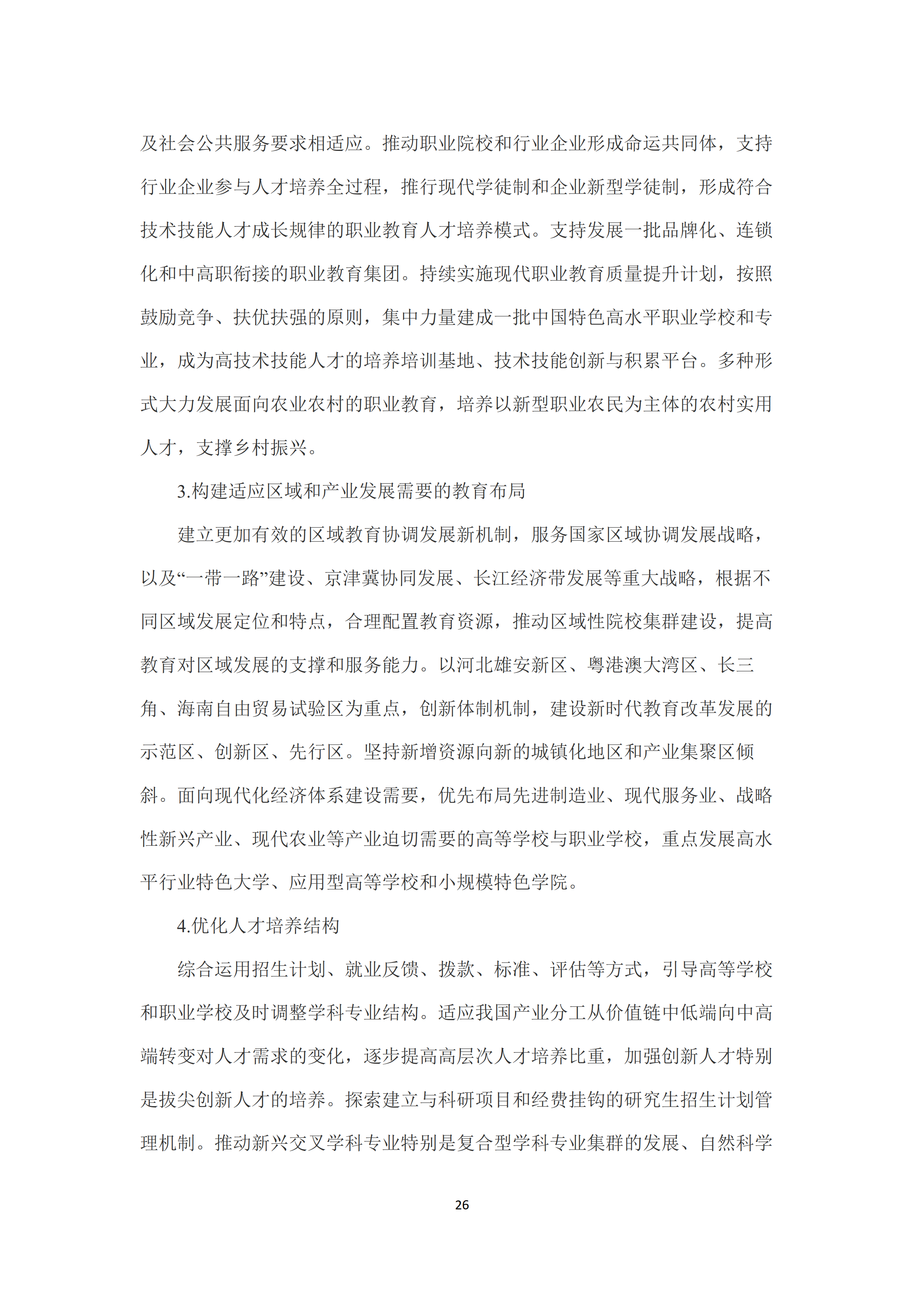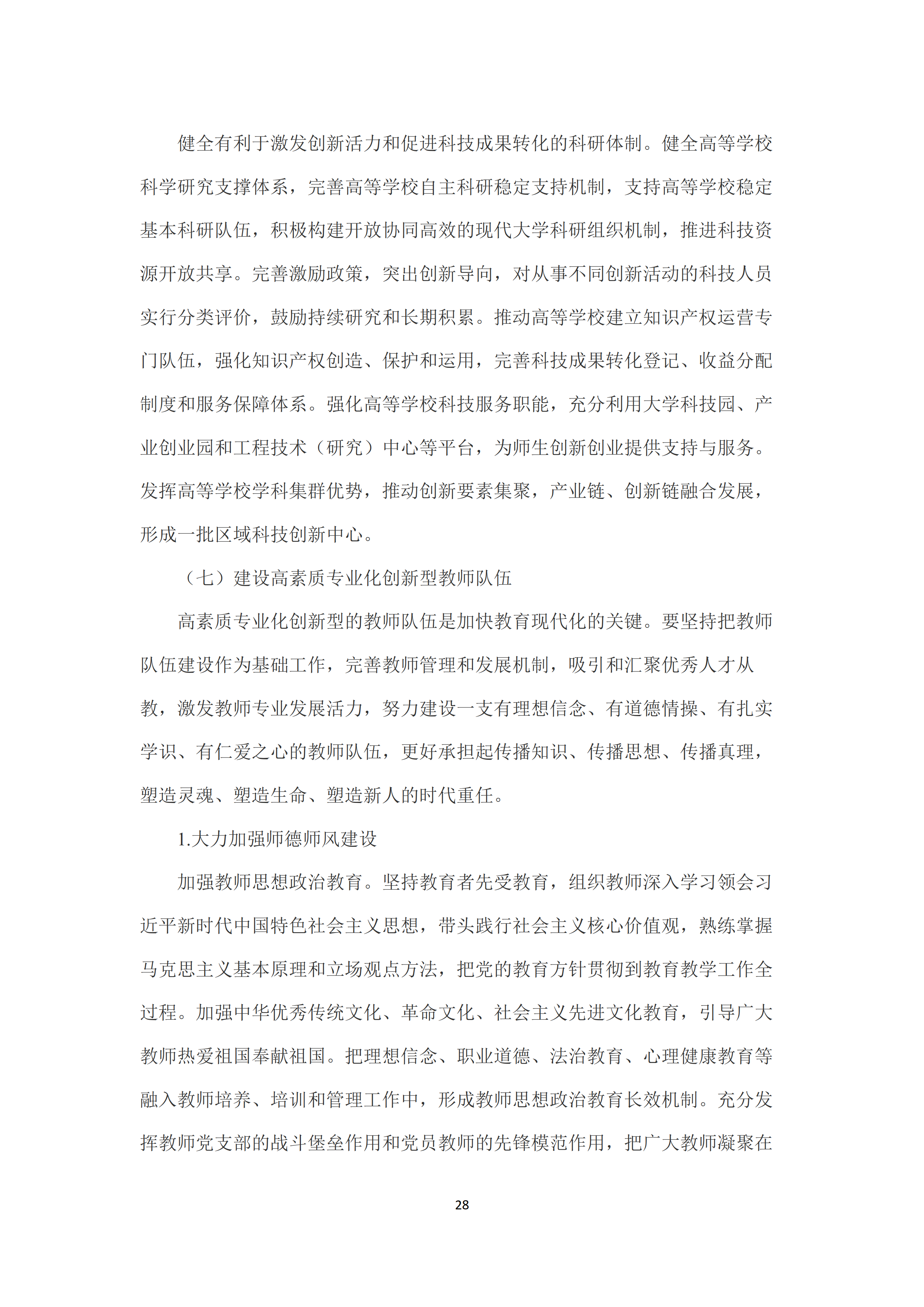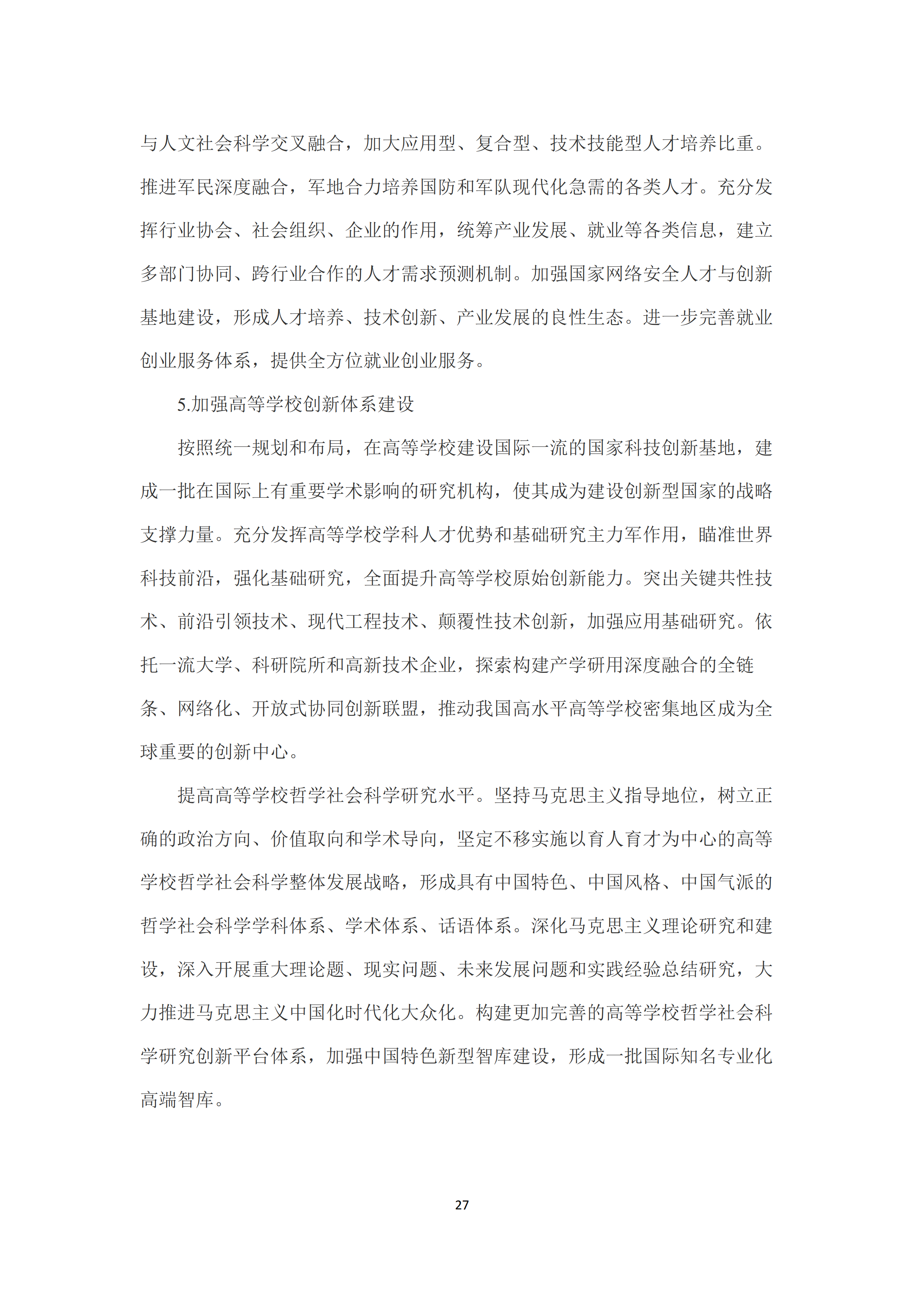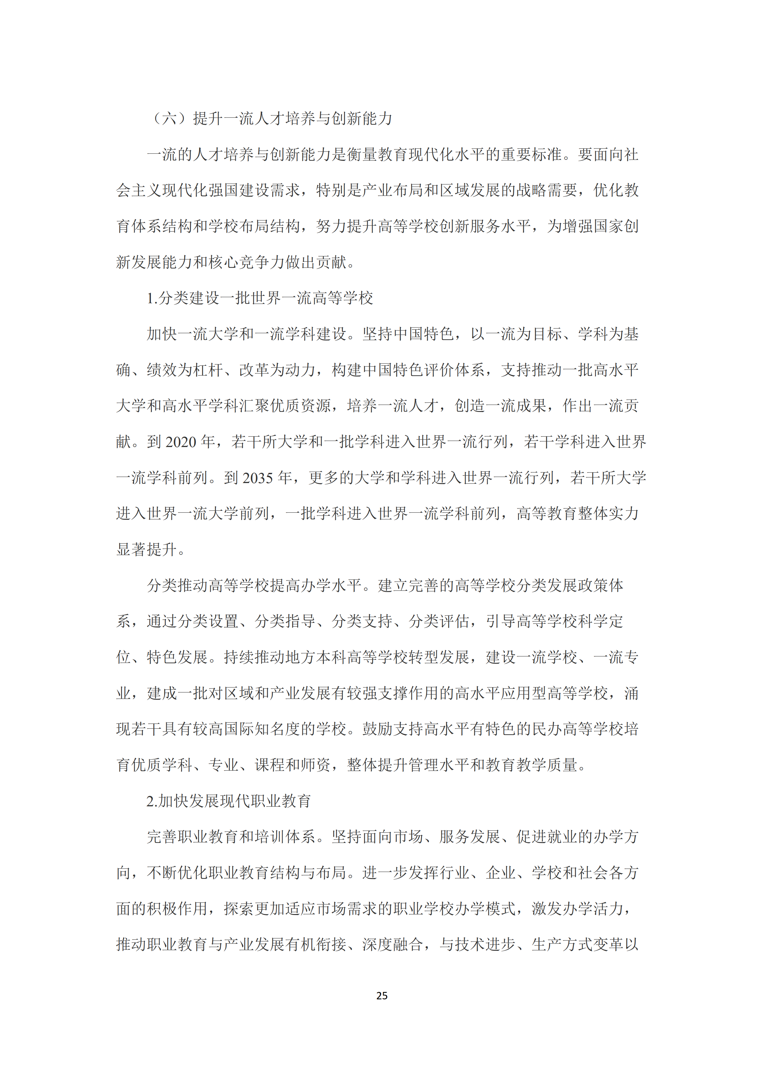六是提升一流人才培养与创新能力。分类建设一批世界一流高等学校,建立完善的高等学校分类发展政策体系,引导高等学校科学定位、特色发展🙅🏽‍♂️。持续推动地方本科高等学校转型发展。加快发展现代职业教育,不断优化职业教育结构与布局。推动职业教育与产业发展有机衔接🕣、深度融合,集中力量建成一批中国特色高水平职业院校和专业🦹🏿‍♂️。优化人才培养结构🐌,综合运用招生计划、就业反馈、拨款、标准、评估等方式🧗🏻‍♂️,引导高等学校和职业学校及时调整学科专业结构。加强创新人才特别是拔尖创新人才的培养⌨️,加大应用型😩、复合型🧗‍♂️、技术技能型人才培养比重🎓。加强高等学校创新体系建设,建设一批国际一流的国家科技创新基地,加强应用基础研究♞,全面提升高等学校原始创新能力。探索构建产学研用深度融合的全链条🖐🏻、网络化👯、开放式协同创新联盟。提高高等学校哲学社会科学研究水平,加强中国特色新型智库建设。健全有利于激发创新活力和促进科技成果转化的科研体制。