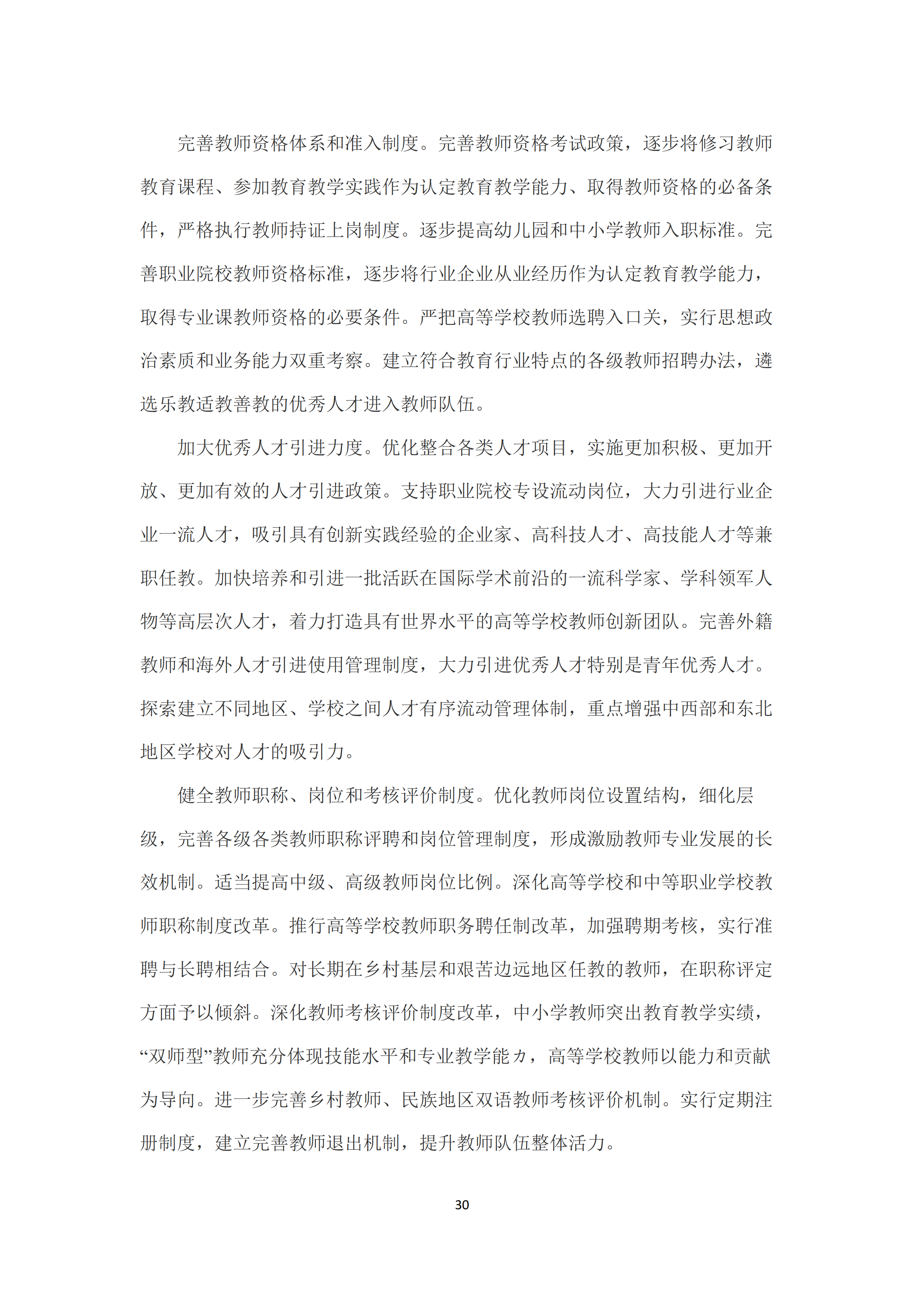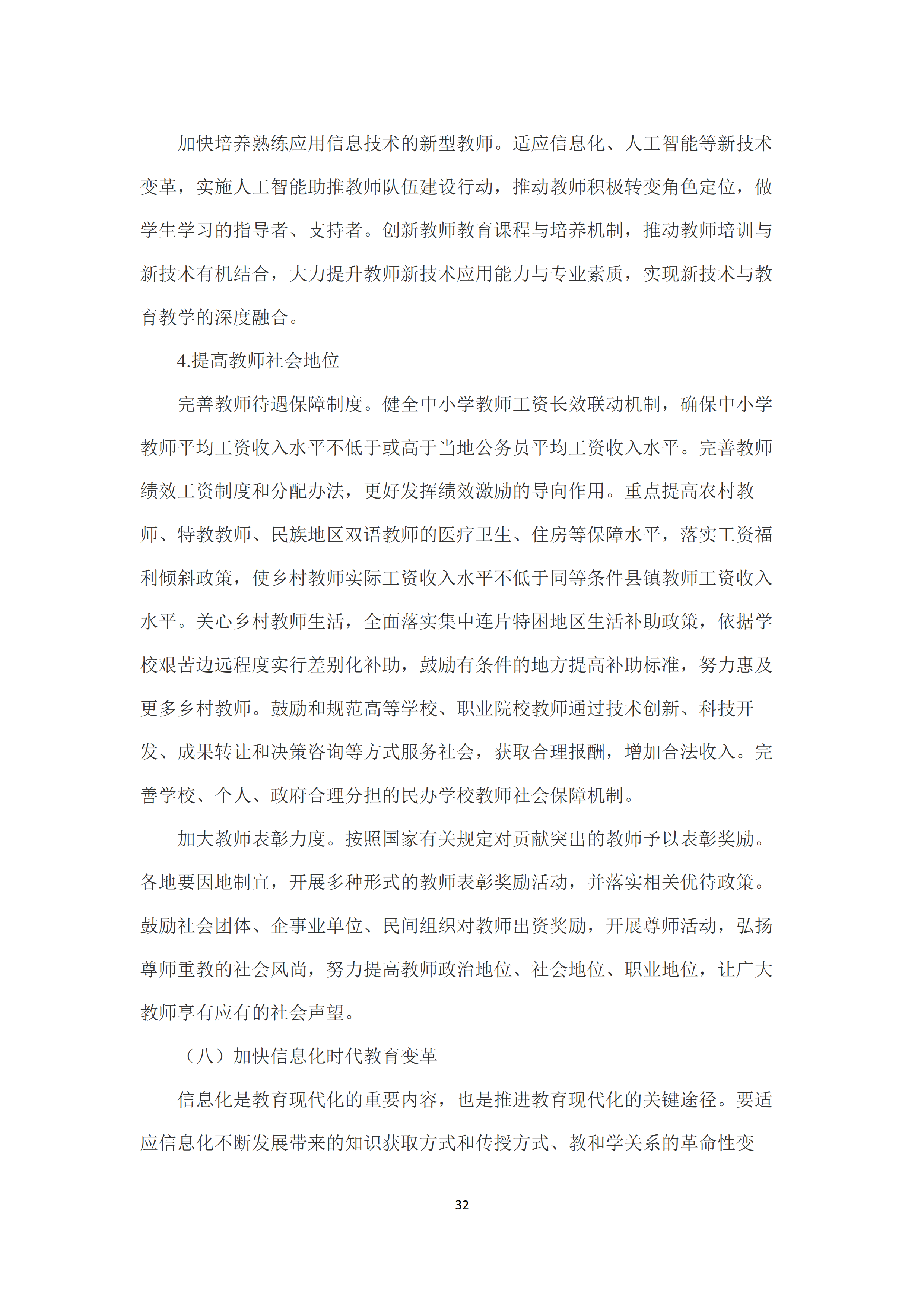 七是建设高素质专业化创新型教师队伍✍🏼。大力加强师德师风建设🍕,将师德师风作为评价教师素质的第一标准,推动师德建设长效化、制度化。加大教职工统筹配置和跨区域调整力度,切实解决教师结构性👮🏿‍♂️、阶段性🏮🧑‍🌾、区域性短缺问题。完善教师资格体系和准入制度🍟。健全教师职称💖、岗位和考核评价制度🥄💇。培养高素质教师队伍,健全以师范院校为主体、高水平非师范院校参与、优质中小学(幼儿园)为实践基地的开放☣️、协同、联动的中国特色教师教育体系👨🏻‍⚖️🦉。强化职前教师培养和职后教师发展的有机衔接3️⃣。夯实教师专业发展体系,推动教师终身学习和专业自主发展。提高教师社会地位🕎✹,完善教师待遇保障制度,健全中小学教师工资长效联动机制,全面落实集中连片特困地区生活补助政策。加大教师表彰力度♉️🪥,努力提高教师政治地位🤽🏻‍♀️、社会地位🍬👨🏻‍🎤、职业地位。