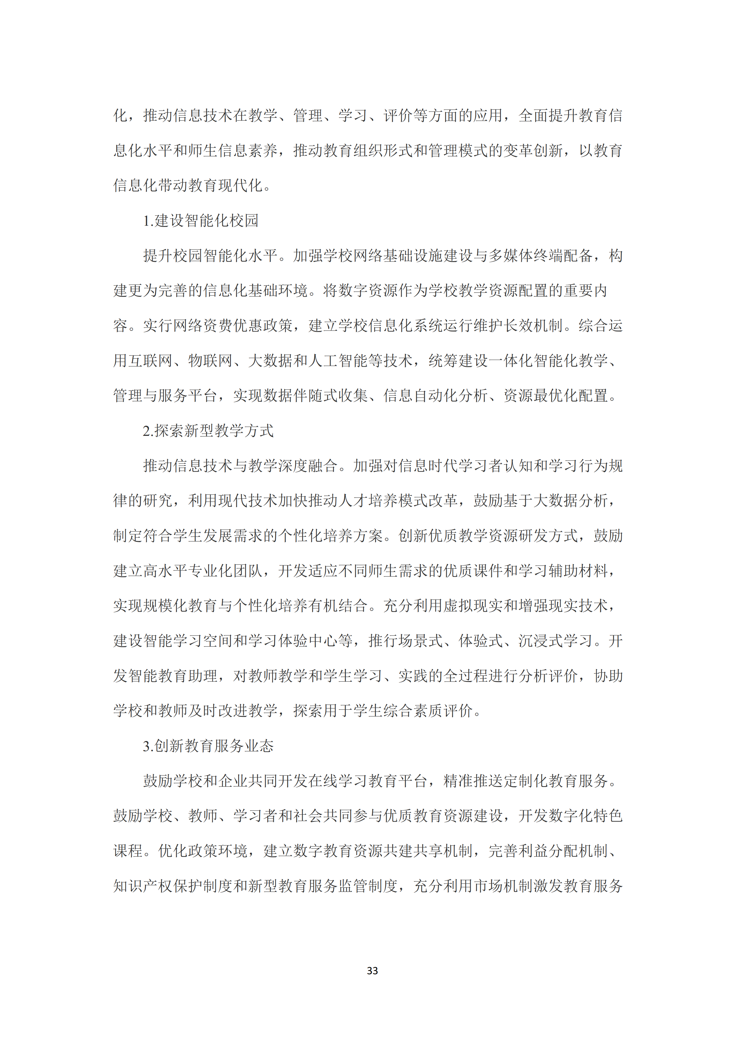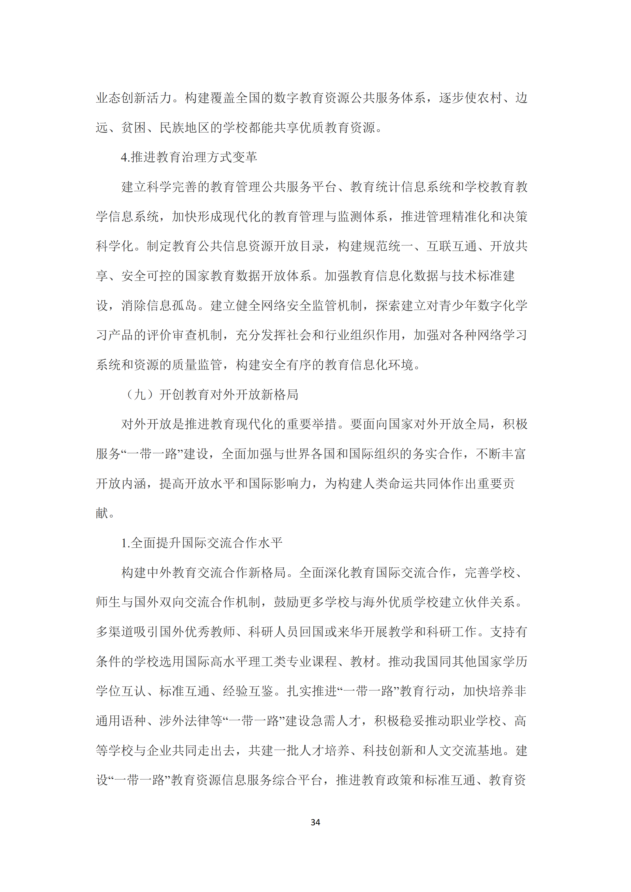 八是加快信息化时代教育变革。建设智能化校园,统筹建设一体化智能化教学、管理与服务平台。利用现代技术加快推动人才培养模式改革,实现规模化教育与个性化培养的有机结合👨🏽‍🔬。创新教育服务业态,建立数字教育资源共建共享机制,完善利益分配机制、知识产权保护制度和新型教育服务监管制度📝。推进教育治理方式变革,加快形成现代化的教育管理与监测体系,推进管理精准化和决策科学化。
