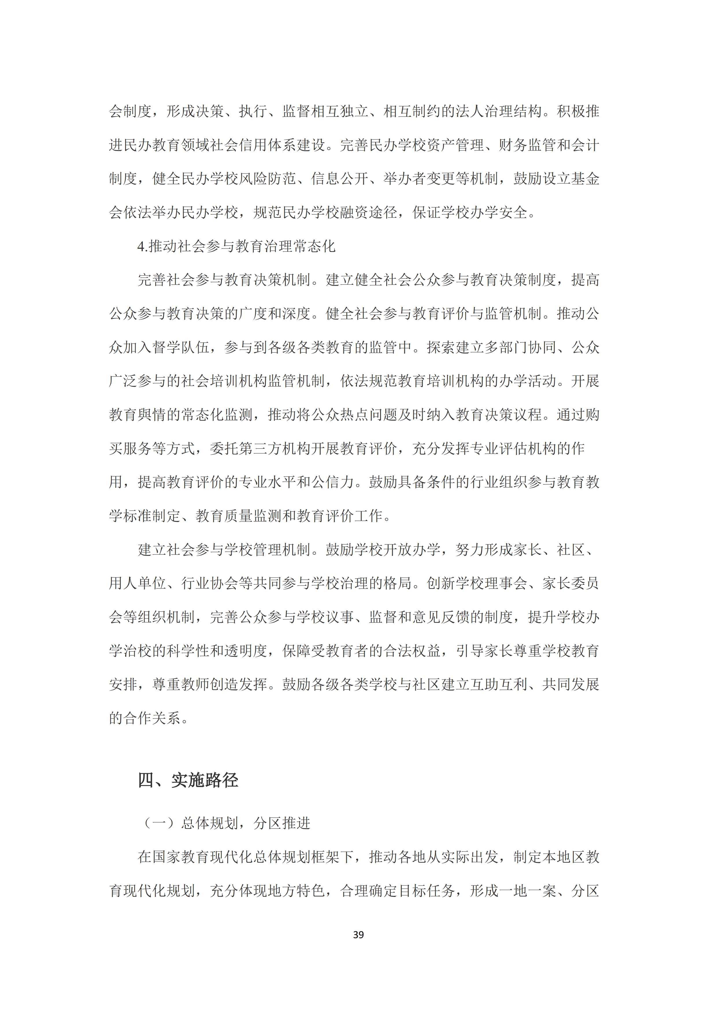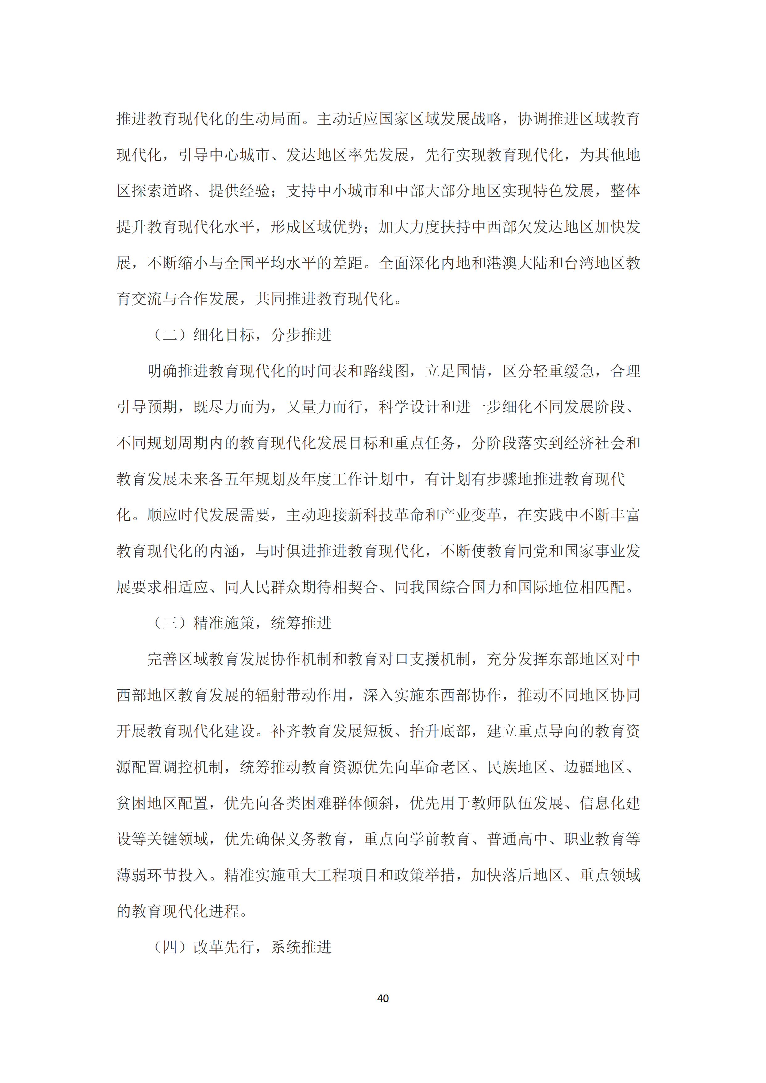 《中国教育现代化2035》明确了实现教育现代化的实施路径:一是总体规划🥫🤾🏻,分区推进🙄🕞。在国家教育现代化总体规划框架下🛣,推动各地从实际出发👌,制定本地区教育现代化规划🌋,形成一地一案💅🏽、分区推进教育现代化的生动局面。二是细化目标🥹🧑🏼‍🦱,分步推进🍢🧑🏼‍⚖️。科学设计和进一步细化不同发展阶段🕵🏻‍♀️、不同规划周期内的教育现代化发展目标和重点任务🌿,有计划有步骤地推进教育现代化。三是精准施策,统筹推进。完善区域教育发展协作机制和教育对口支援机制,深入实施东西部协作🧣,推动不同地区协同推进教育现代化建设。四是改革先行,系统推进。充分发挥基层特别是各级各类学校的积极性和创造性,鼓励大胆探索、积极改革创新,形成充满活力、富有效率、更加开放、有利于高质量发展的教育体制机制🚣。
