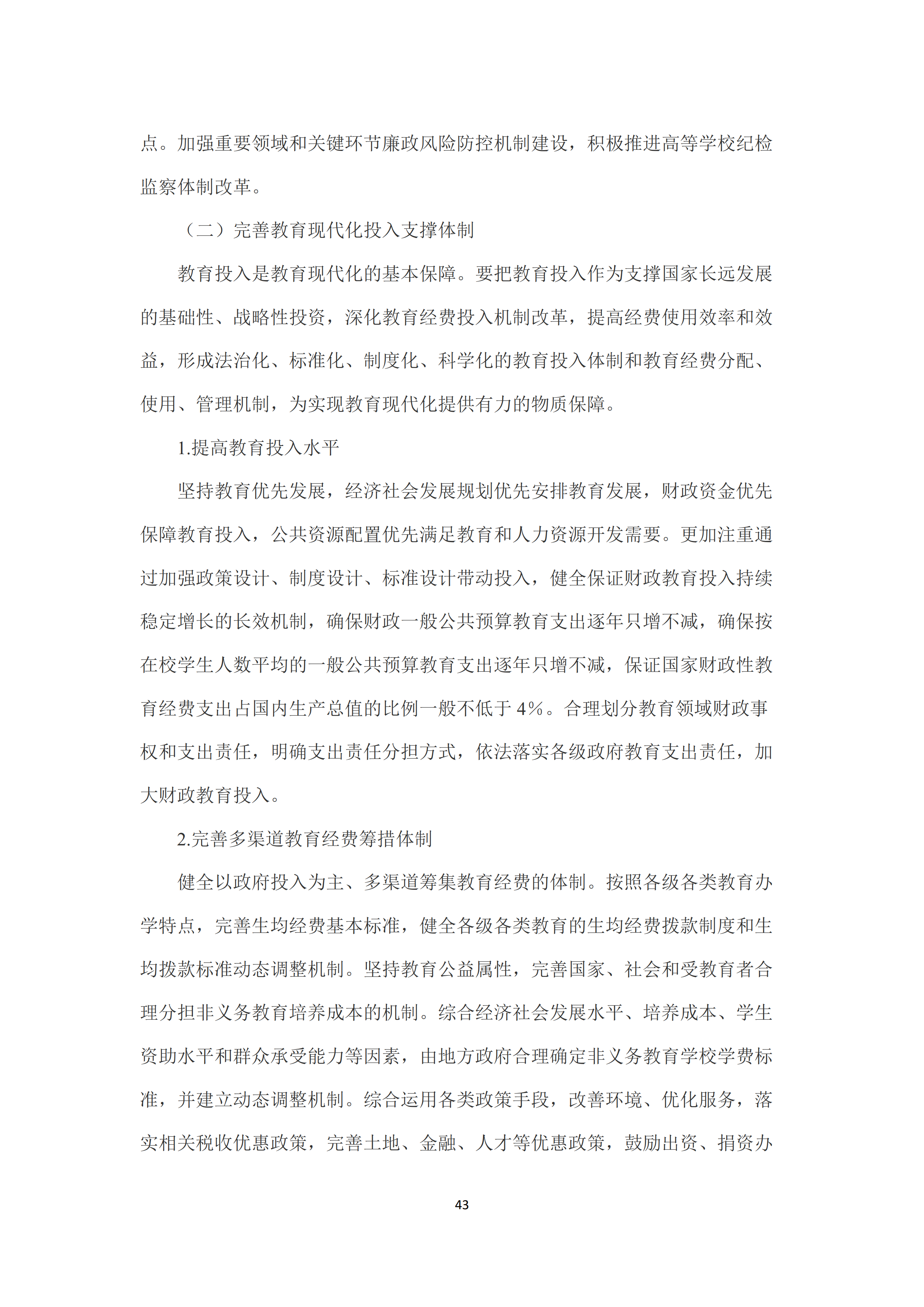 二是完善教育现代化投入支撑体制。健全保证财政教育投入持续稳定增长的长效机制,确保财政一般公共预算教育支出逐年只增不减🛎,确保按在校学生人数平均的一般公共预算教育支出逐年只增不减🙋🏻‍♂️,保证国家财政性教育经费支出占国内生产总值的比例一般不低于4%。依法落实各级政府教育支出责任,完善多渠道教育经费筹措体制♦︎,完善国家、社会和受教育者合理分担非义务教育培养成本的机制🪰,支持和规范社会力量兴办教育。优化教育经费使用结构,全面实施绩效管理,建立健全全覆盖全过程全方位的教育经费监管体系,全面提高经费使用效益。
